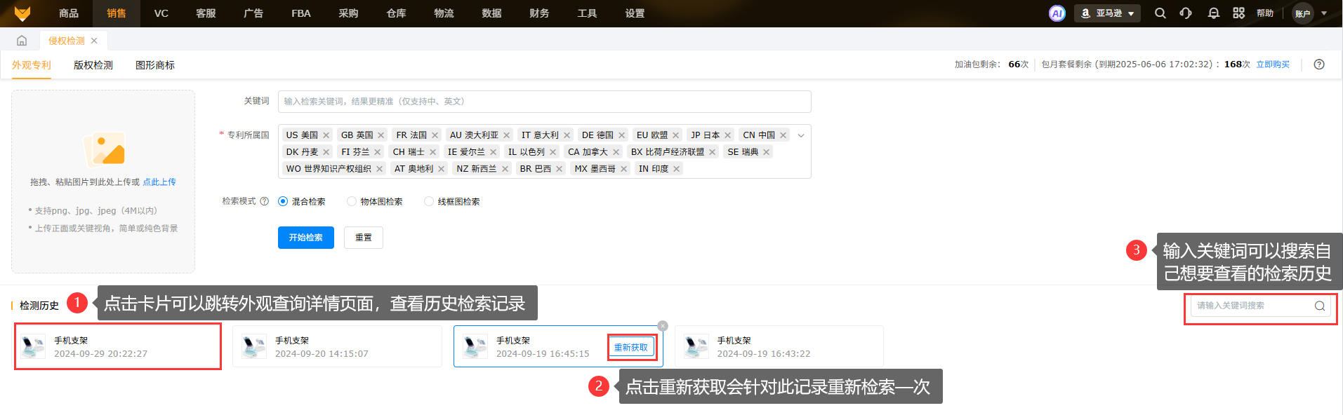 A1:上传图片,选择专利所属国以及检索模式后点击开始检索就会消耗一次次数,检索后【检索历史】中会出现一个卡片,点击可以查看详情,查看详情不消耗次数,如果点击【重新检索】会再消耗一次次数。