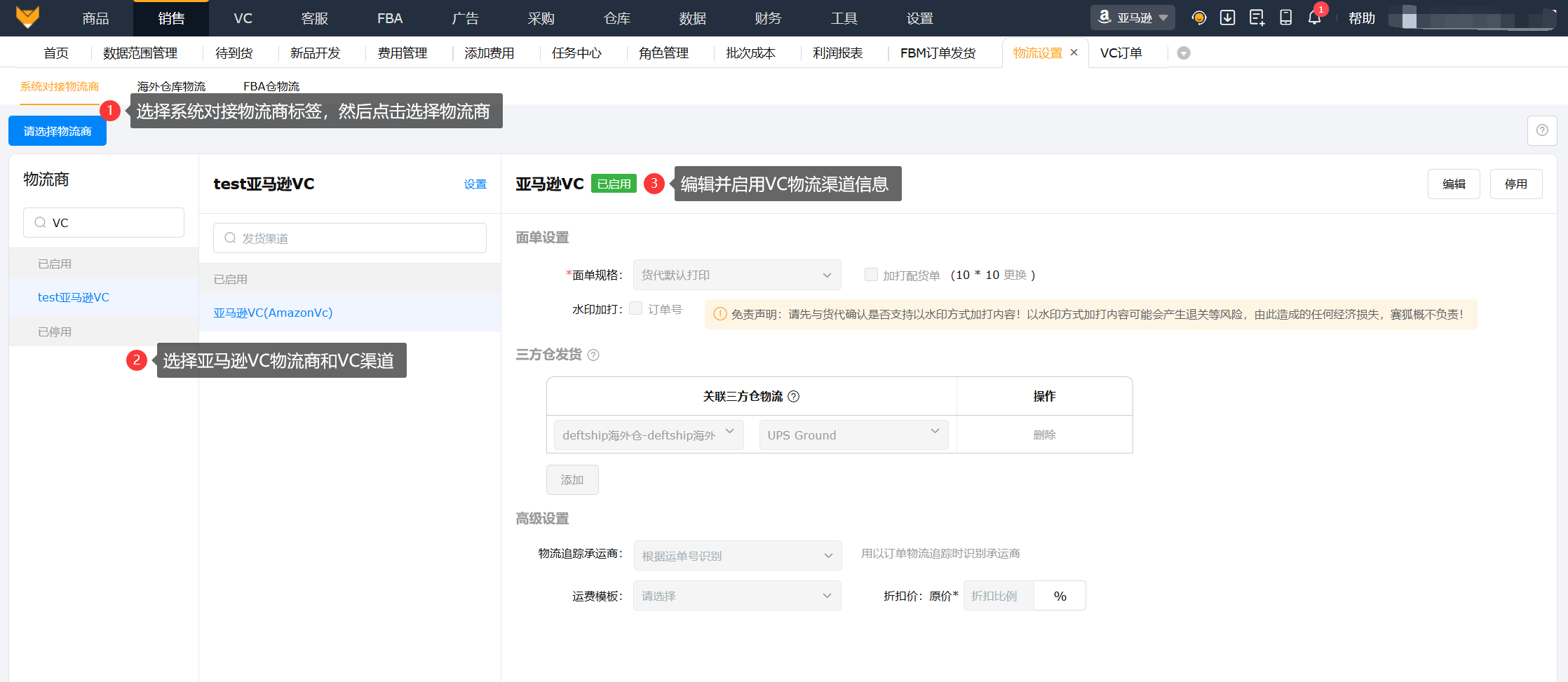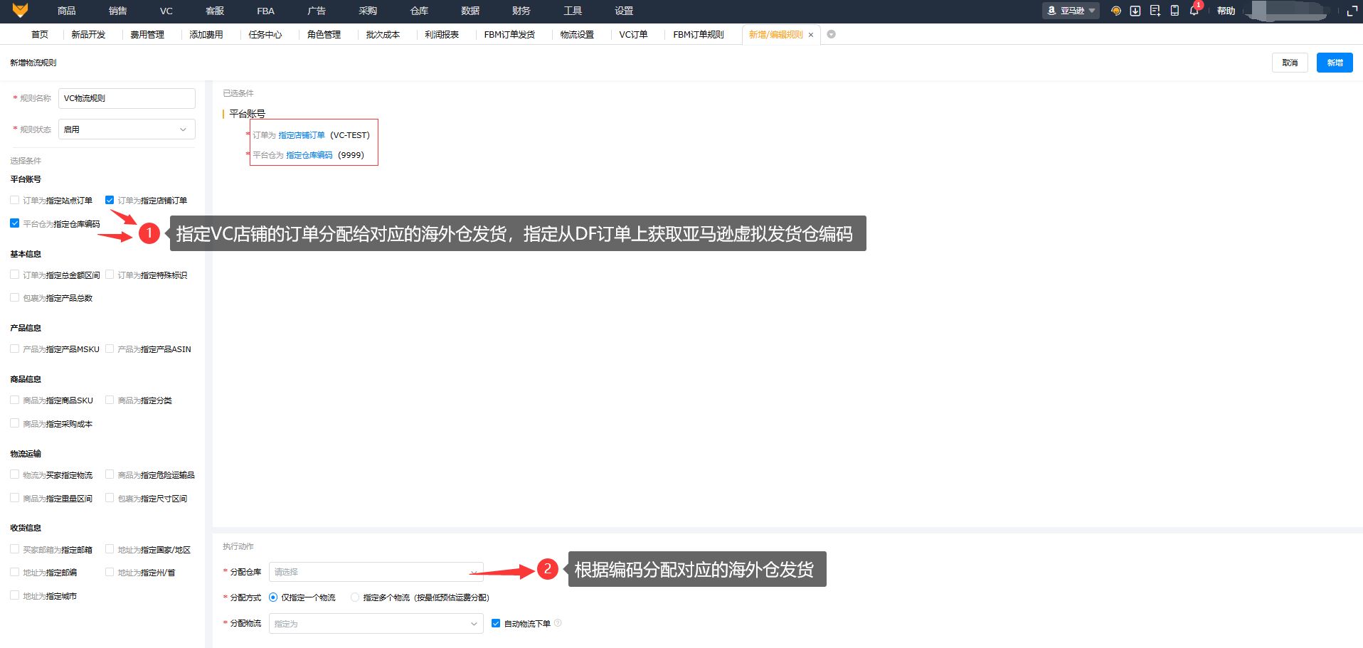 FBM订单发货在生成DF订单包裹后,相对应的FBM订单规则和物流设置可选择指定VC店铺、指定平台仓编码分配对应的三方仓和物流。