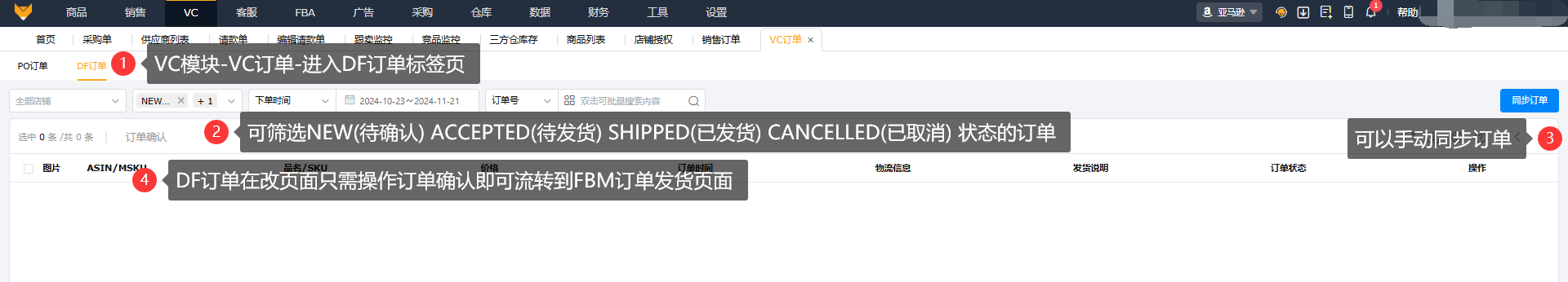 为拥有VC账户的卖家提供快捷高效的DF订单信息的聚合、查询、处理功能,多个VC店铺账号可集中到ERP上确认订单信息到完成发货的全流程。