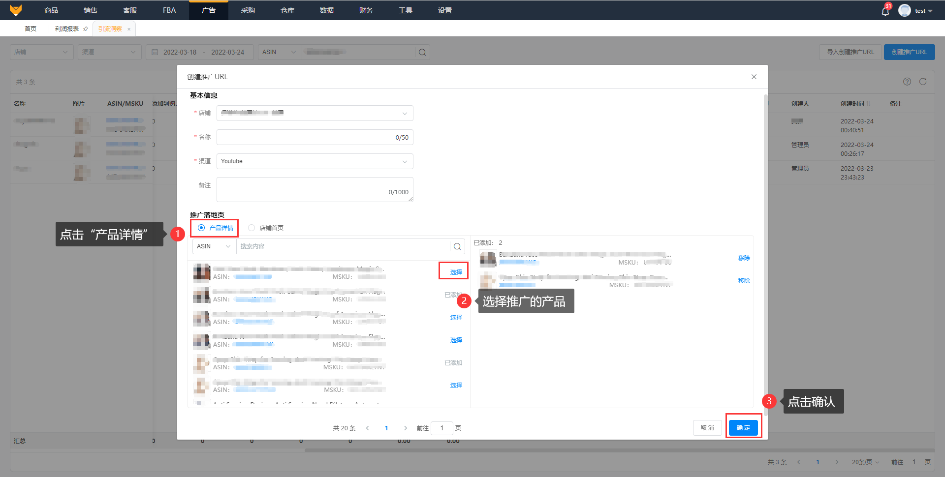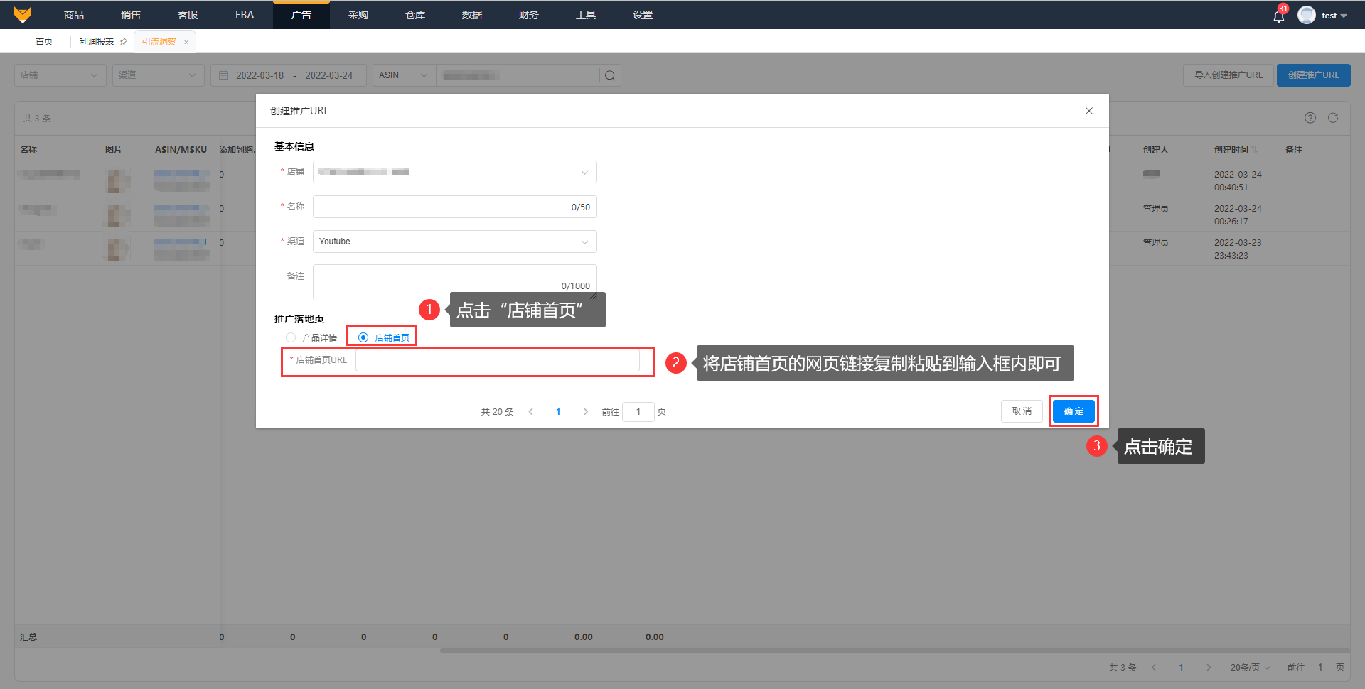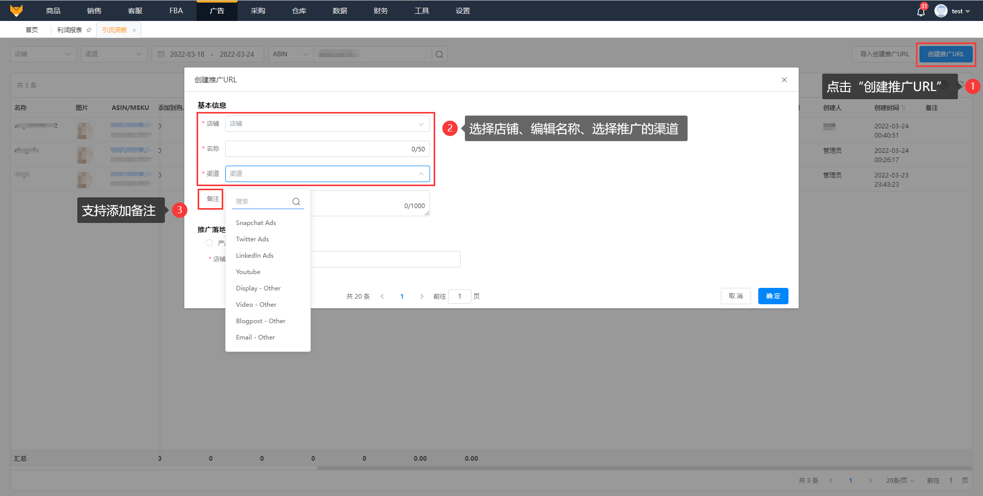 点击“创建推广URL”,选择店铺,编辑名称,选择推广的渠道,支持添加备注;