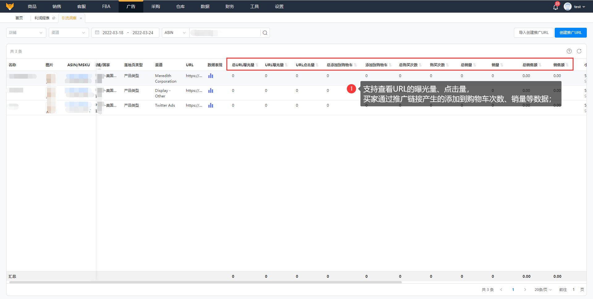 支持查看URL的曝光量、点击量,买家通过推广链接产生的添加到购物车次数、销量等数据。