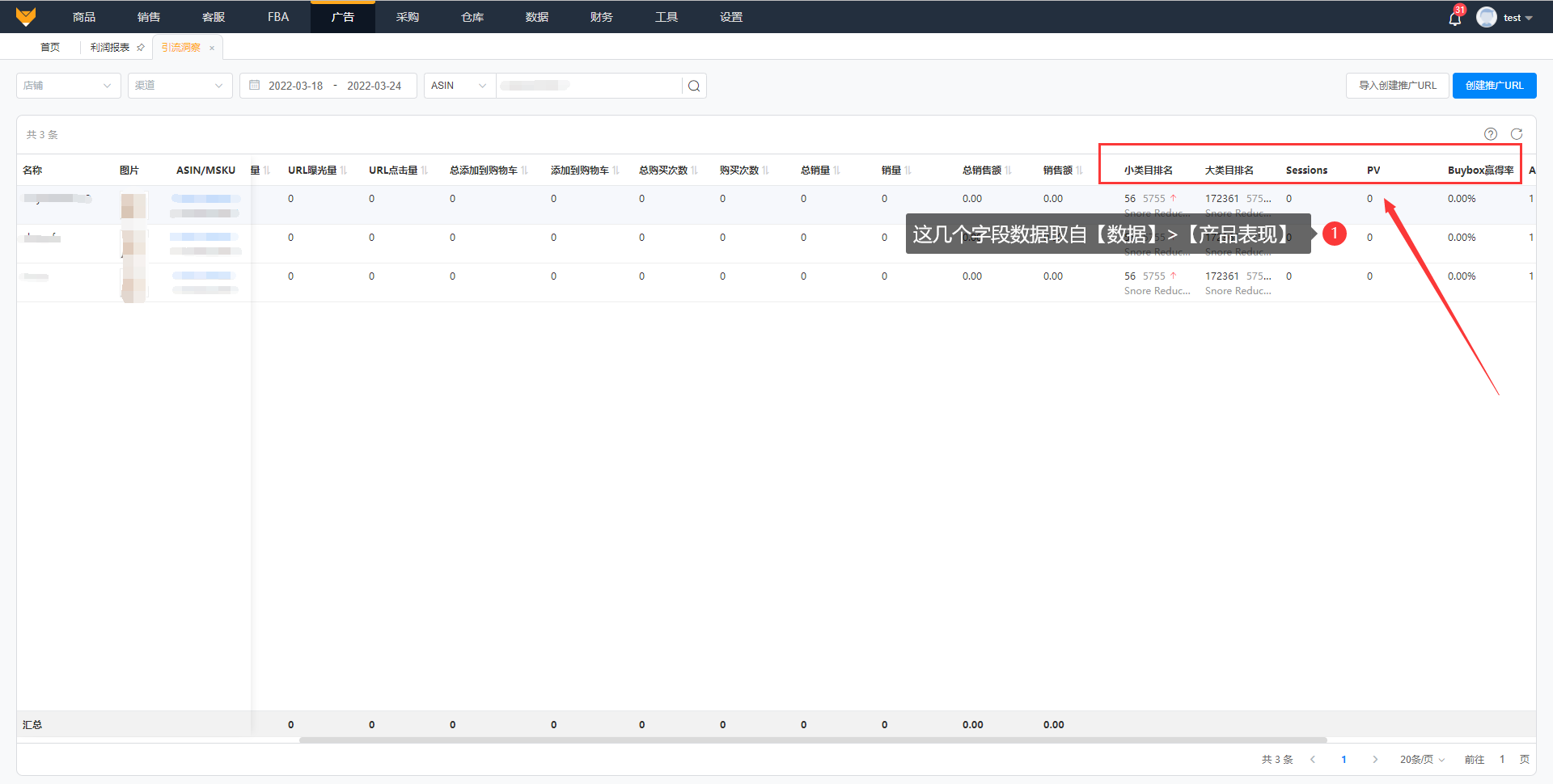 大小类目排名、Sessions、PV等字段数据,取自【数据】>【产品分析】。