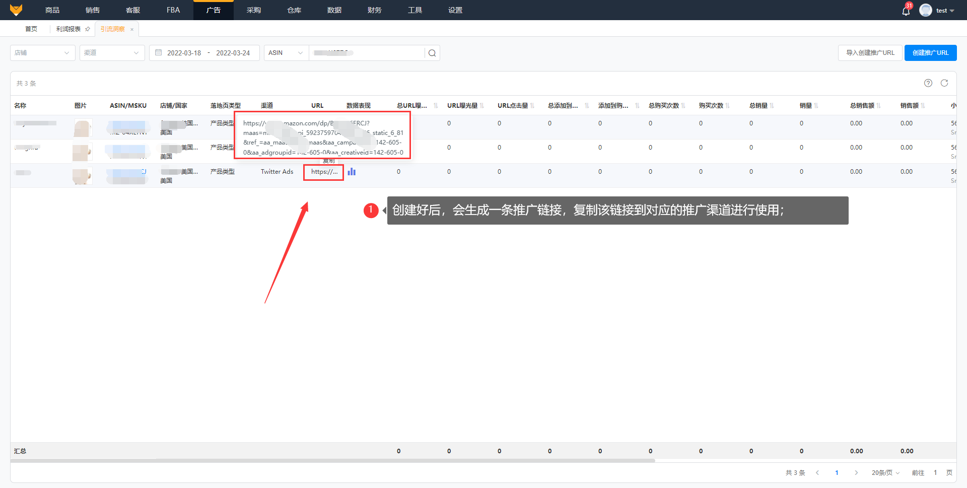 创建好后,会生成一条推广链接,复制该链接到对应的推广渠道进行使用;买家通过点击链接产生的销量等数据,就能在系统统计显示。