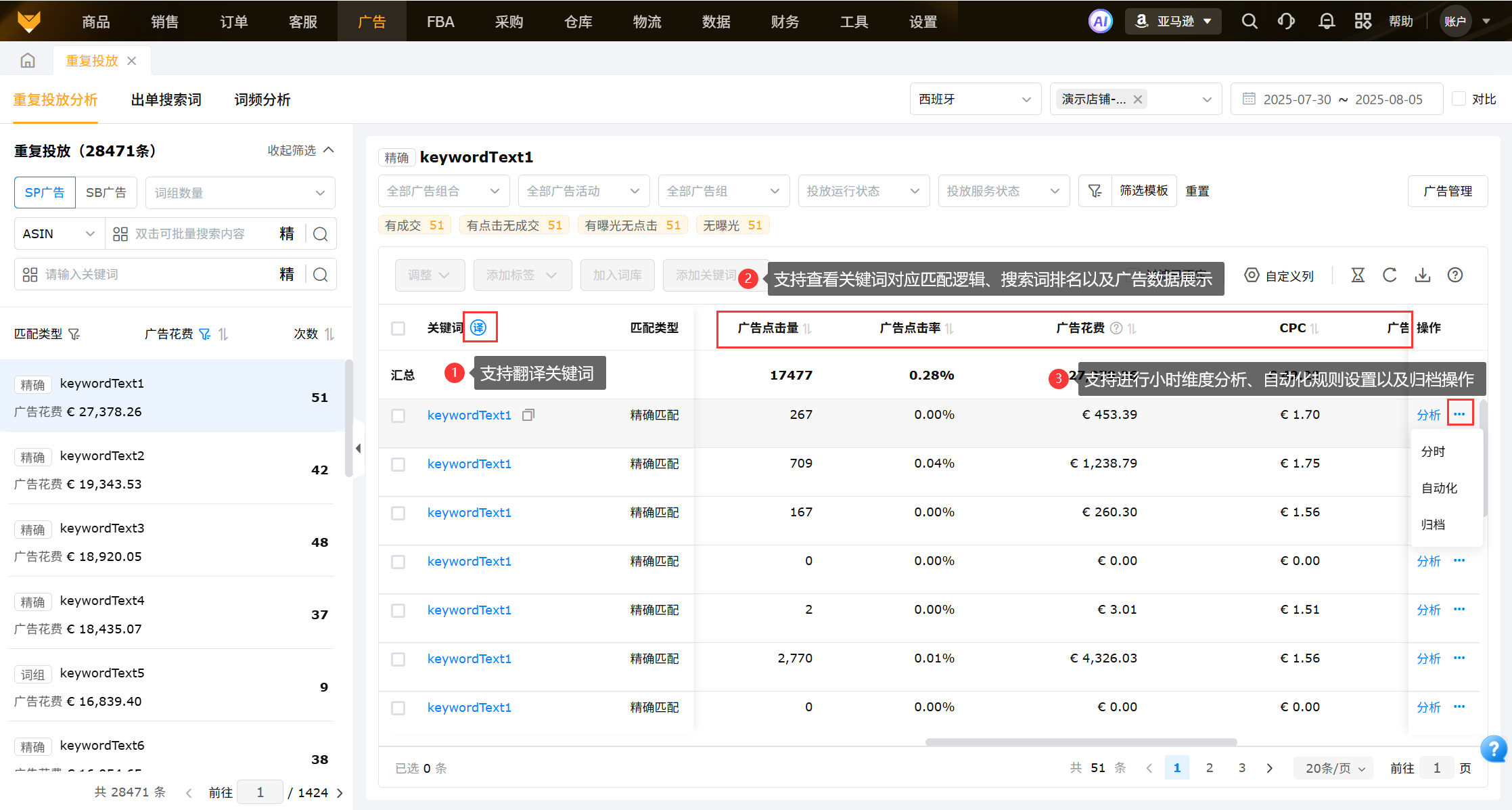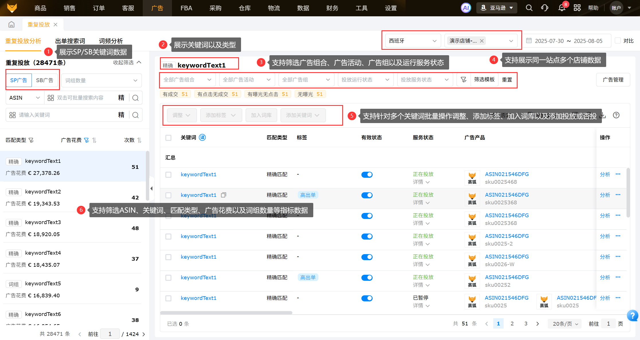 展示同一站点SP、SB类型的重复投放数据,支持以ASIN、关键词搜索;可以筛选次数、匹配类型以及广告花费等指标查看,左侧点击关键词可以展示查看对应广告数据