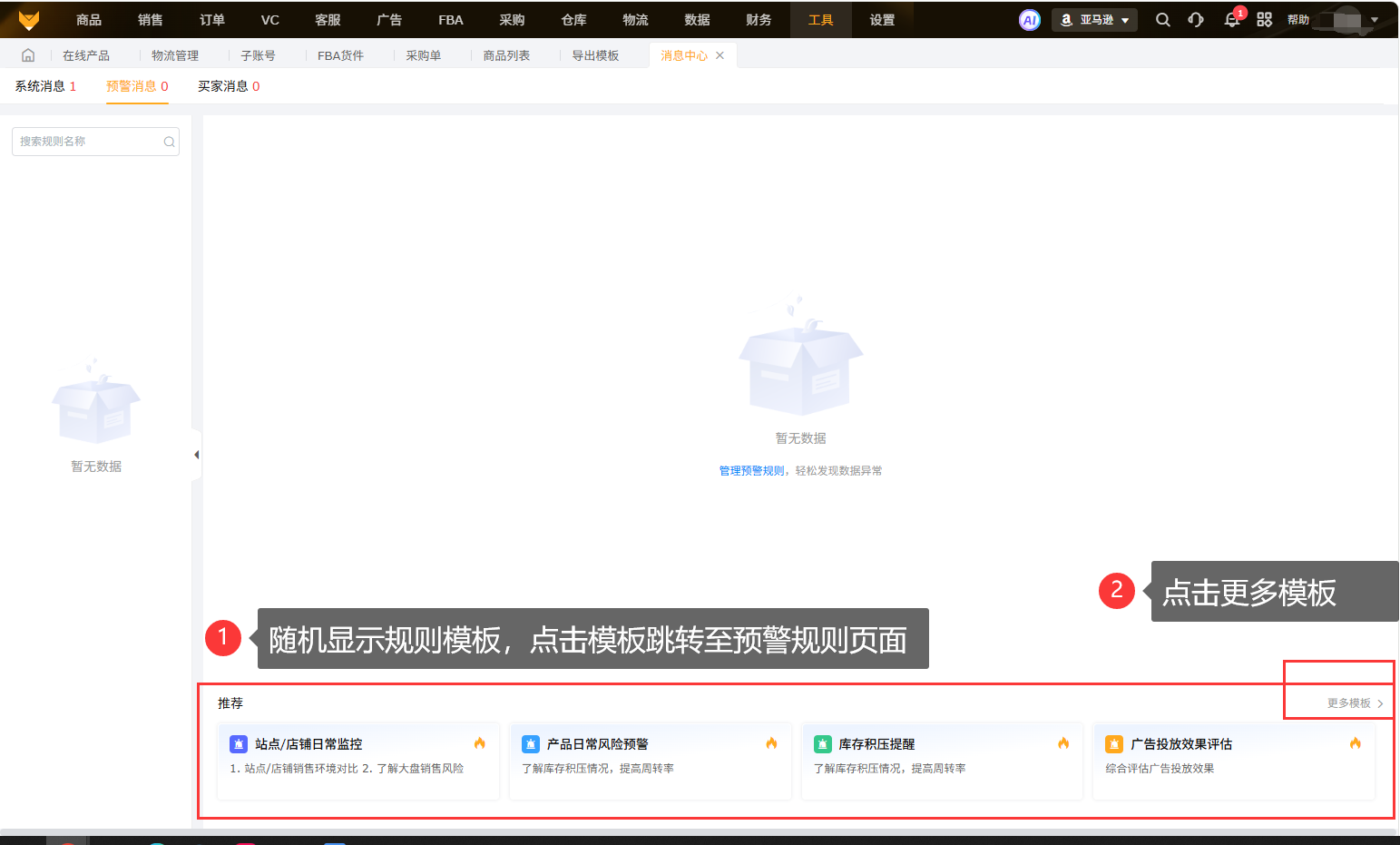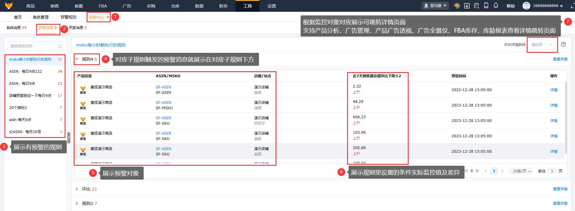 支持按规则查看预警消息,可选择按产品分析、广告管理、产品广告透视、广告全景仪、FBA库存、库龄报表查看详情跳转的页面(根据监控对象对应展示可跳转页面)。
