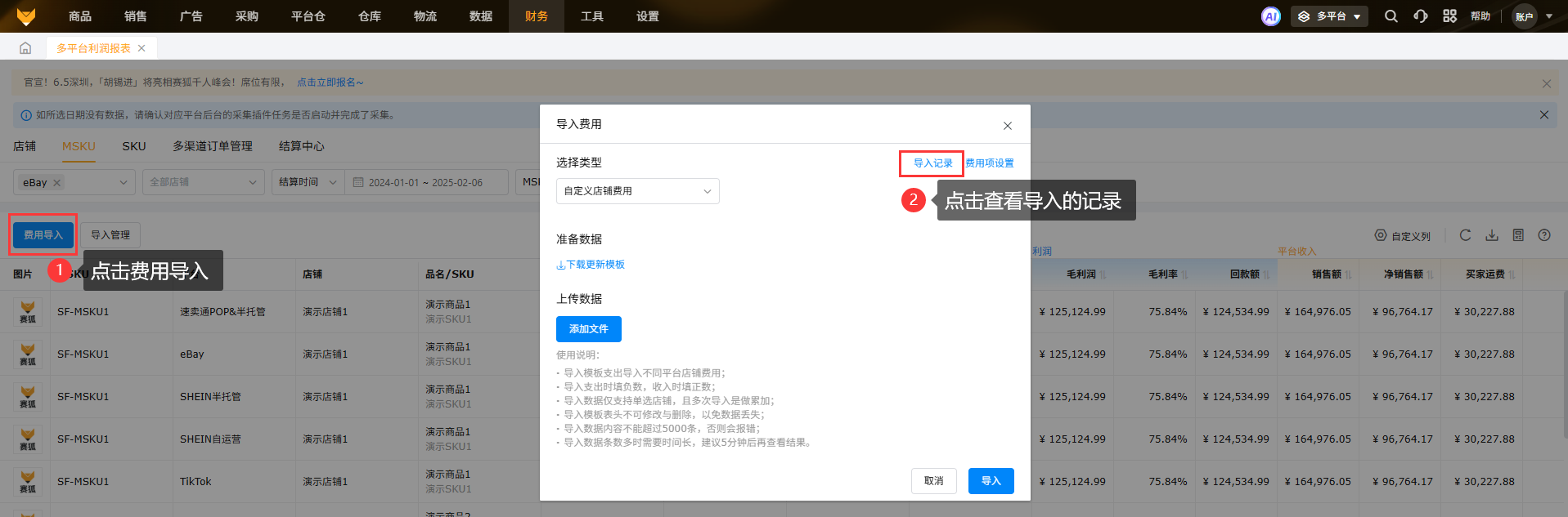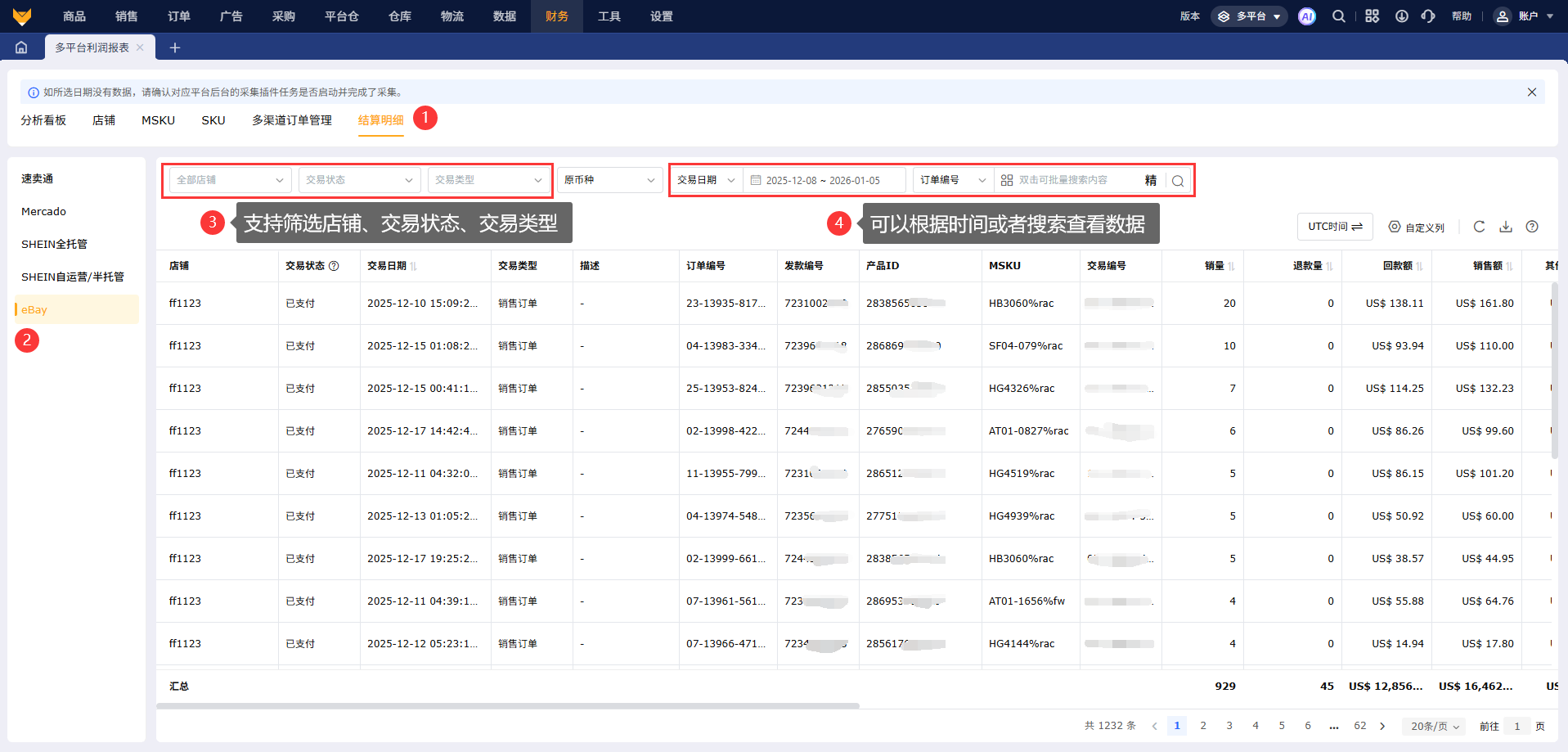 ebay利润报表能通过API接口自动拉取数据,一比一还原ebay后台结算报告,精准核算利润,且支持店铺、MSKU、SKU多维度分析利润数据。