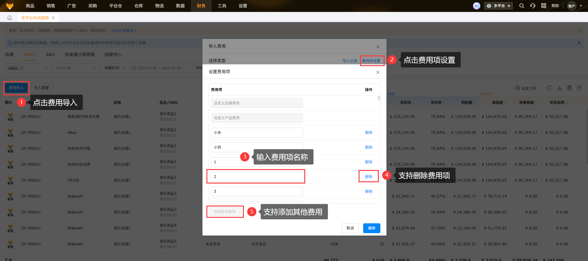 费用项最多可添加200个;点击【设置费用项】,添加其他费用,编辑费用项名称,点击【保存】即可,添加的费用项可用于店铺其他费和产品其他费。