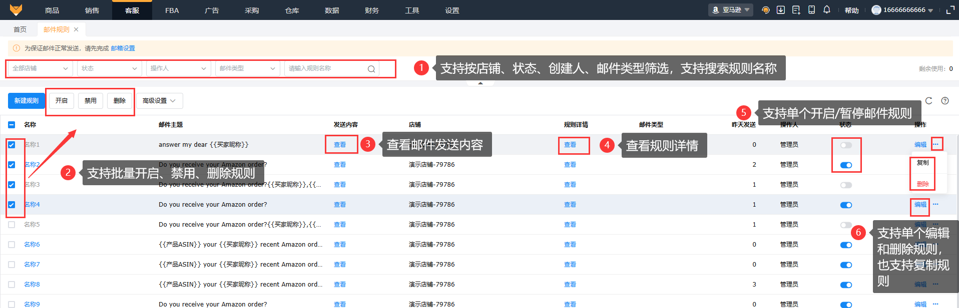 支持店铺、状态、创建人、邮件类型的筛选,支持搜索规则名称。