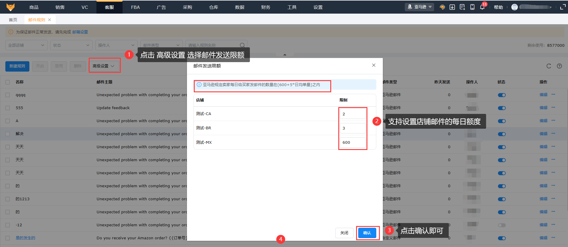 亚马逊规定卖家每日给买家发邮件的数量在(600+5*日均单量)之内,点击“高级设置”,选择邮件发送限额,可设置店铺邮件的每日额度。