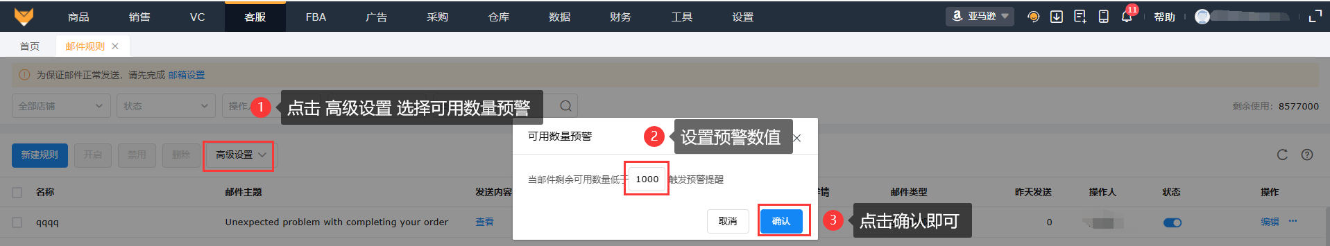 点击“高级设置”,选择可用数量预警,可以设置当邮件剩余可用数量低于某个数值时触发预警提醒。