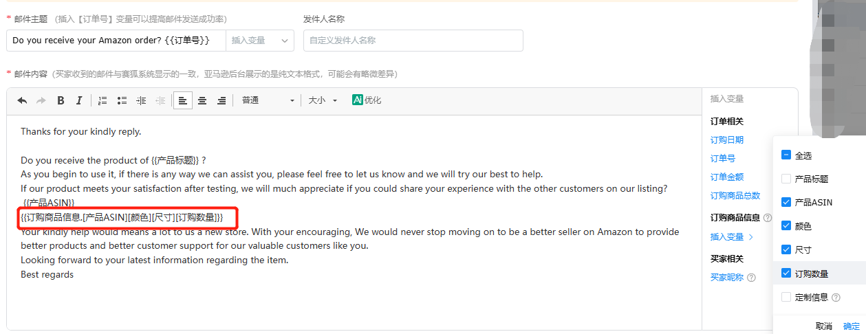 订购商品信息>多选变量>确认,会生成如下格式的变量:{{订购商品信息,[产品ASIN][颜色][尺寸][订购数量]}}