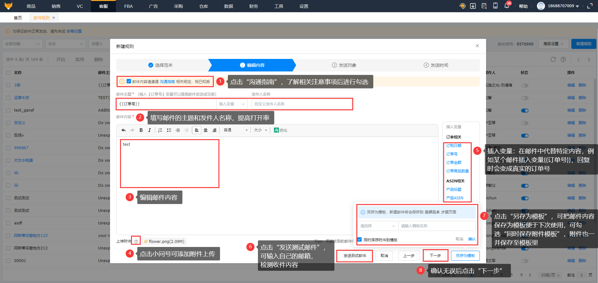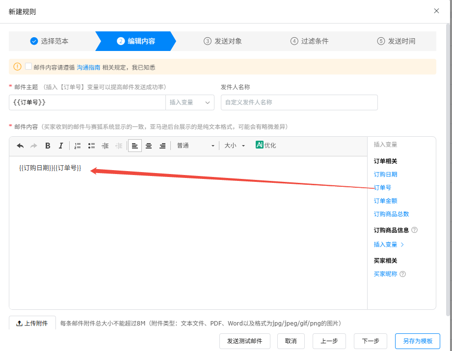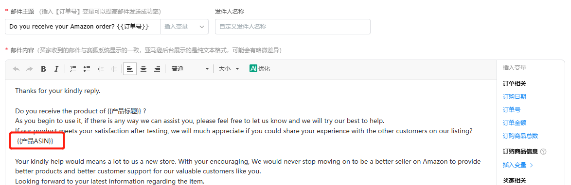 点击 订单号,会在光标位置插入相应变量。您可以将变量插入在邮件内容需要的位置,形成一个通用的邮件规则模板。