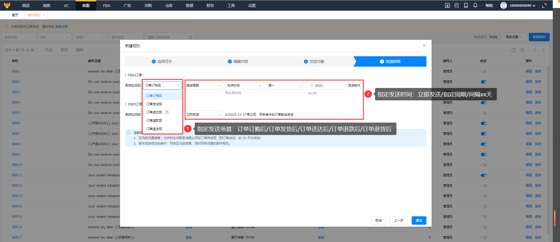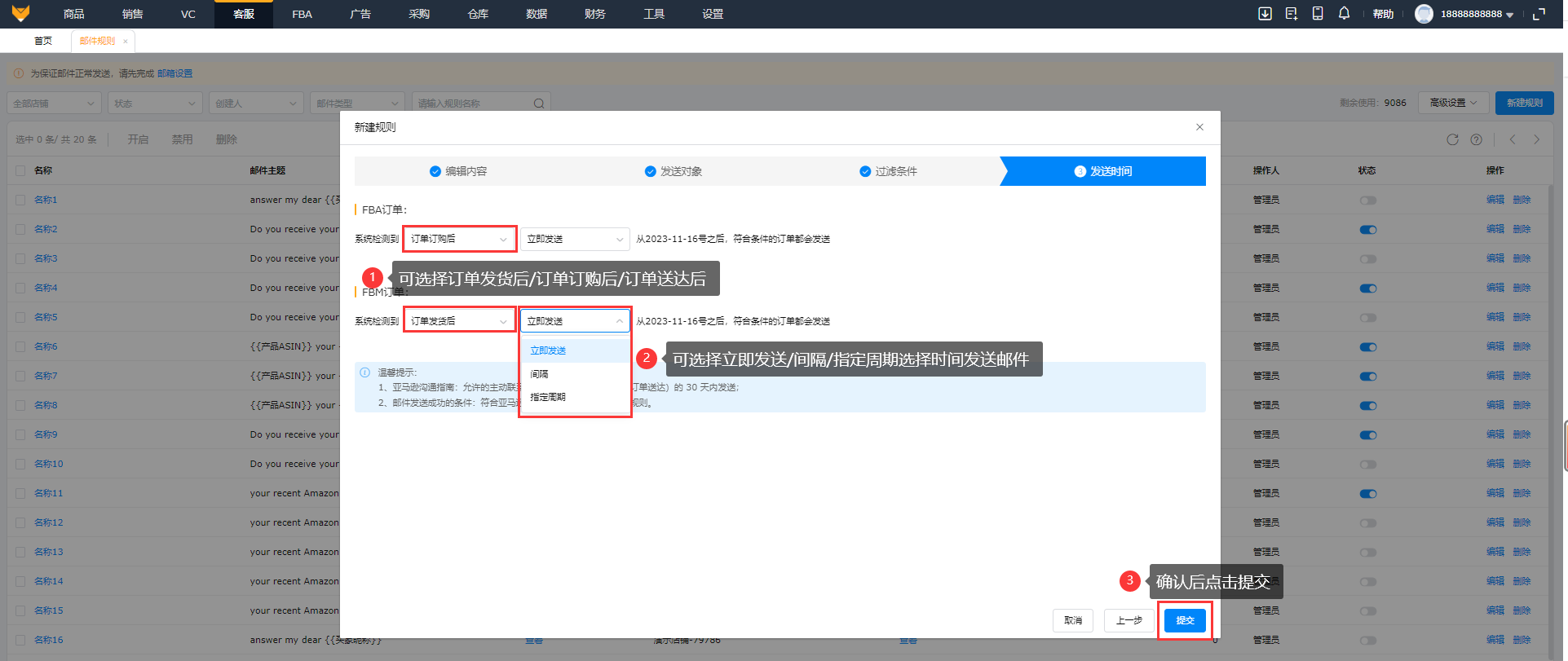 ④发送时间,支持邮件定时发送,可以指定订单发货后第几天发送,以及站点时间或者北京时间的某个时间发送邮件。检查邮件内容,如果有误,可以返回上一步修改。确认无误后,点击提交。