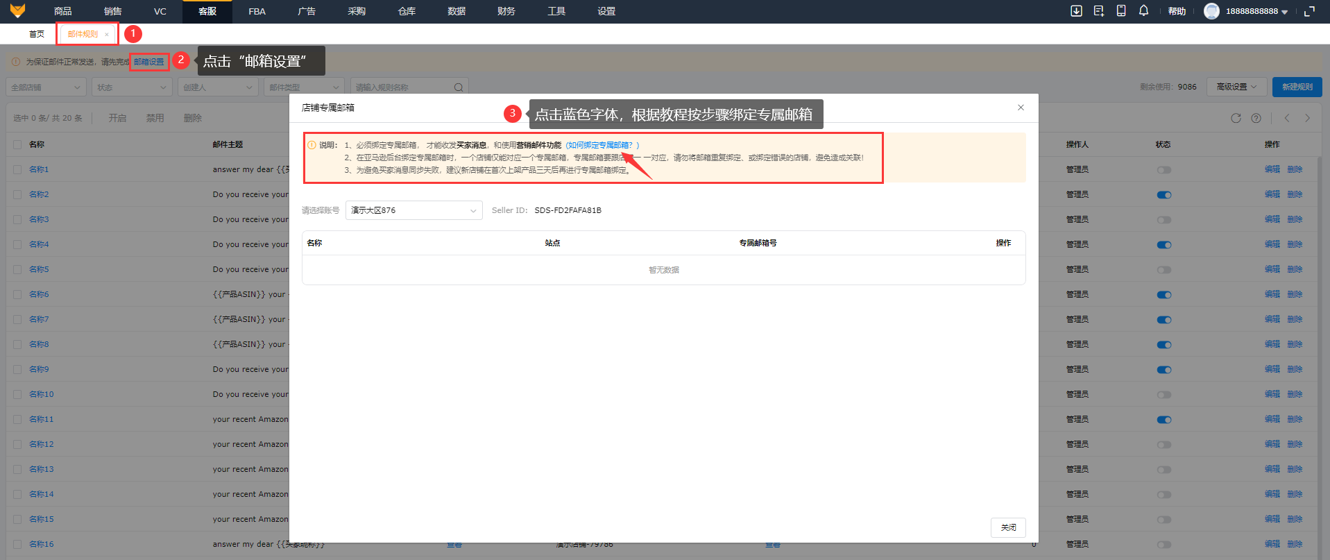 使用营销邮件功能必须在【客服】>【买家消息】绑定专属邮箱,为避免造成关联,绑定操作请务必按照帮助文档操作:【客服】>【买家消息】