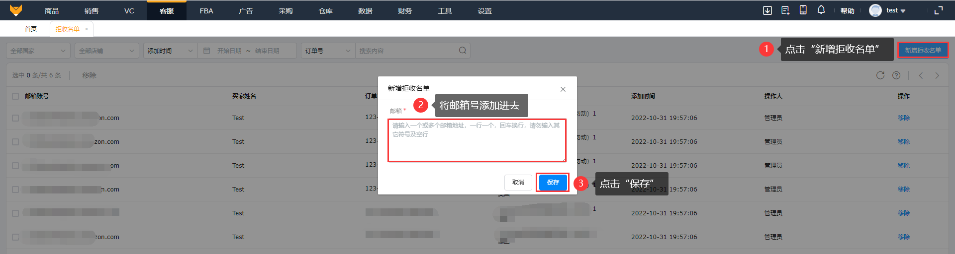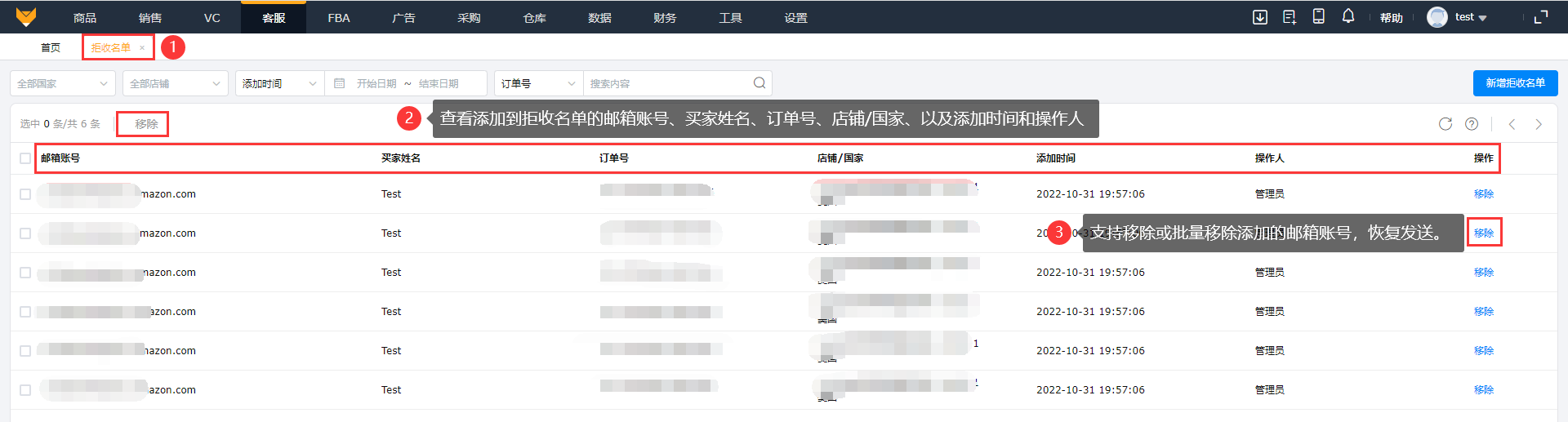 6.2 可以查看添加到拒收名单的邮箱账号,买家姓名,订单号,店铺/国家,以及添加时间和操作人。支持邮箱账号的移除或批量移除,移除之后恢复发送。