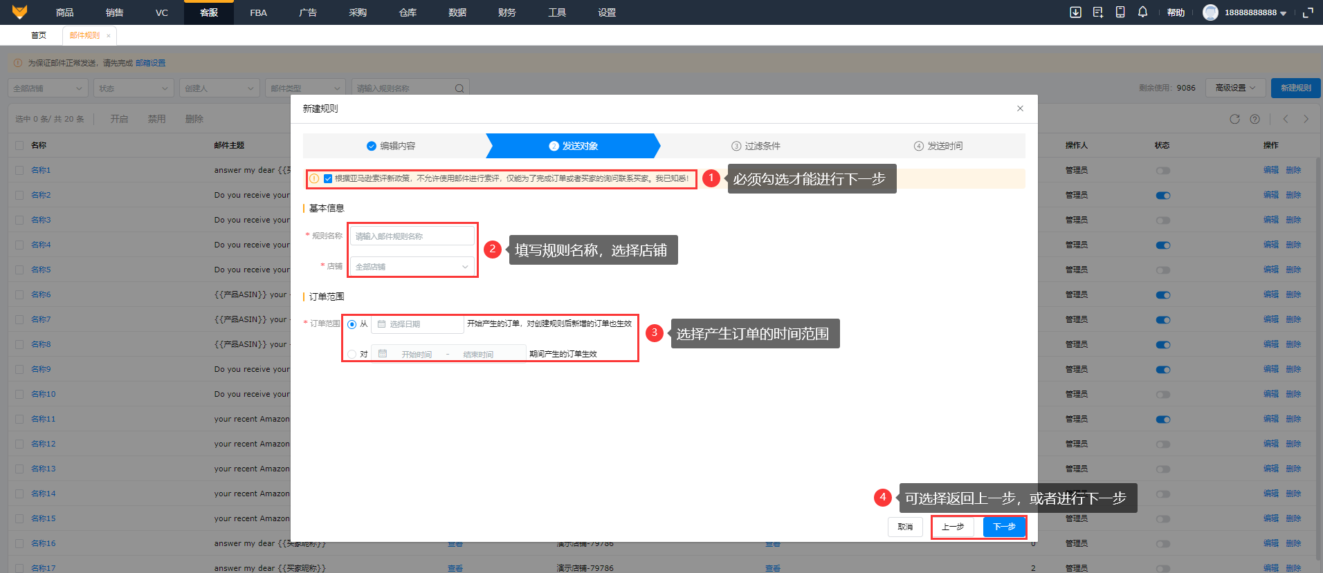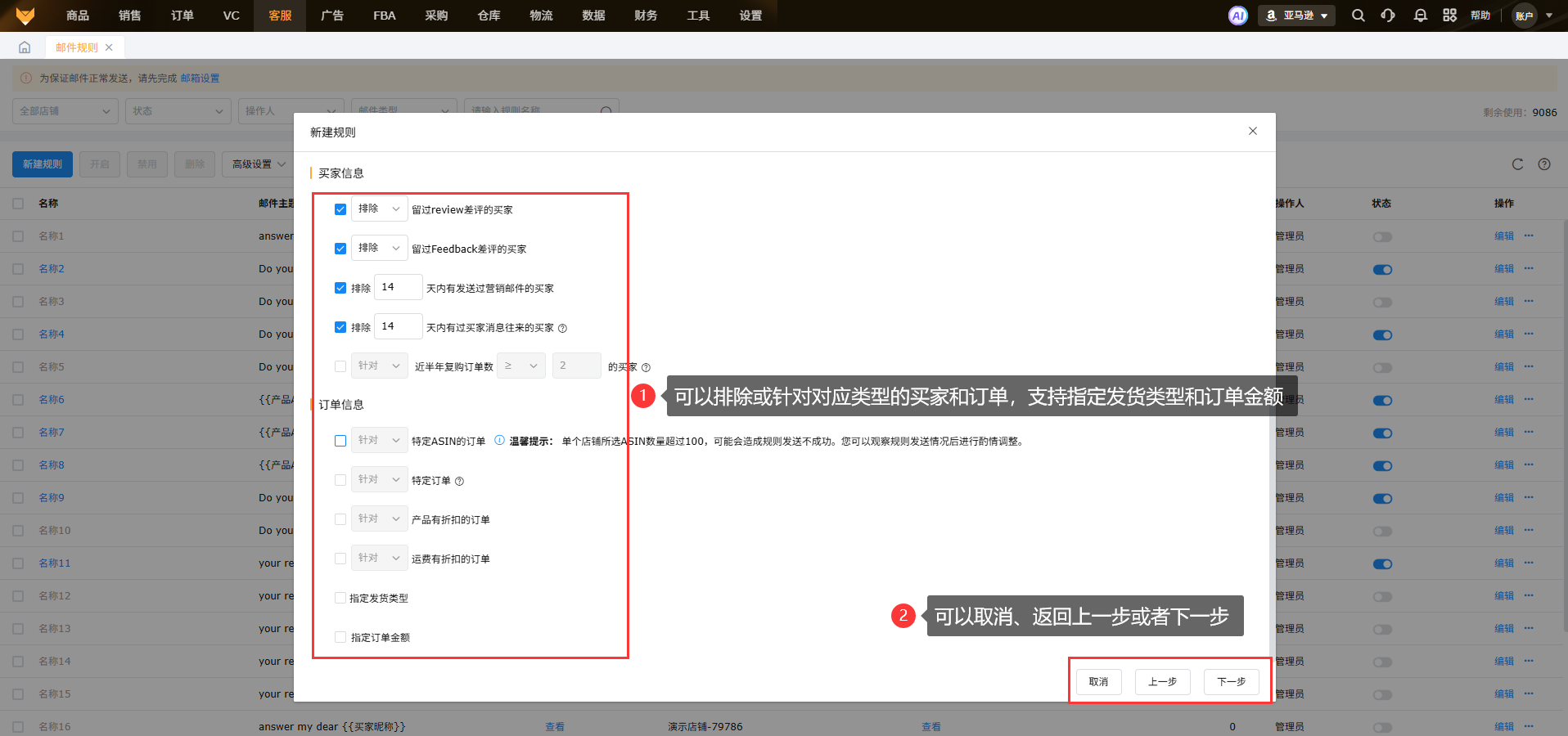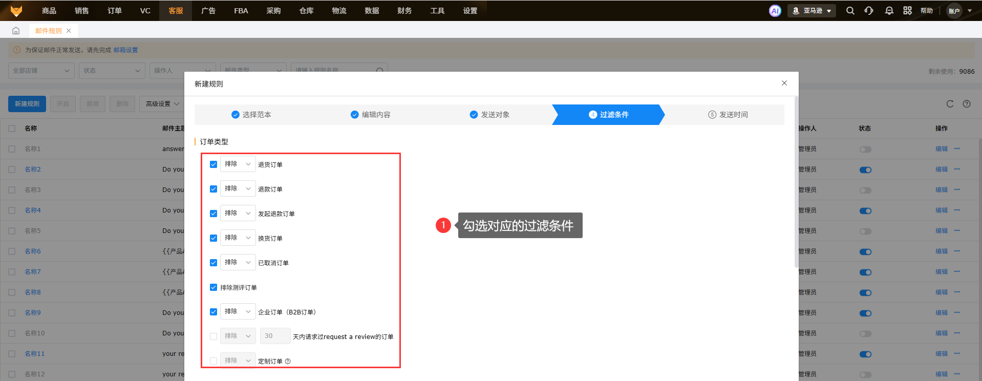 ③发送对象中,需要填写规则名称,选择店铺,选择规则类型,勾选相应的过滤条件(包括不限于:排除或针对 退款订单,退货订单,换货订单,留过review差评的买家等),点击“下一步”,进入到“发送时间”。