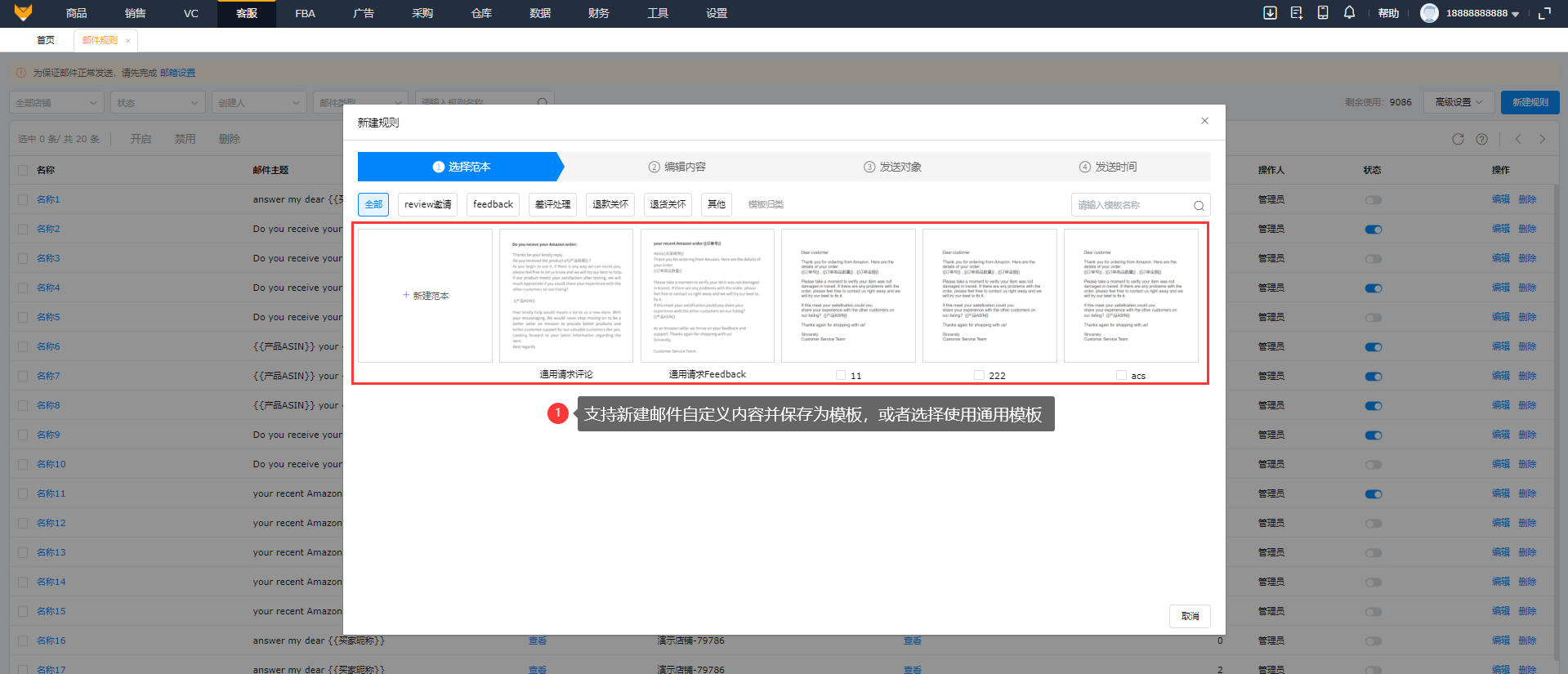 ①点击“新建规则”,选择范本,支持新建邮件自定义内容,或者选择使用通用的邮件模板。