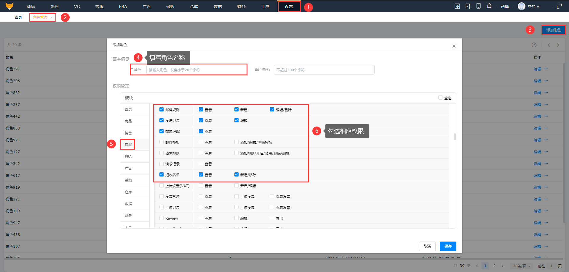 主账号需要给子账号分配使用营销邮件的权限,在【设置】的【角色管理】添加角色,填写角色名称,选择客服模块的邮件规则、发送记录、效果追踪、拒收名单,勾选相应权限,点击保存。