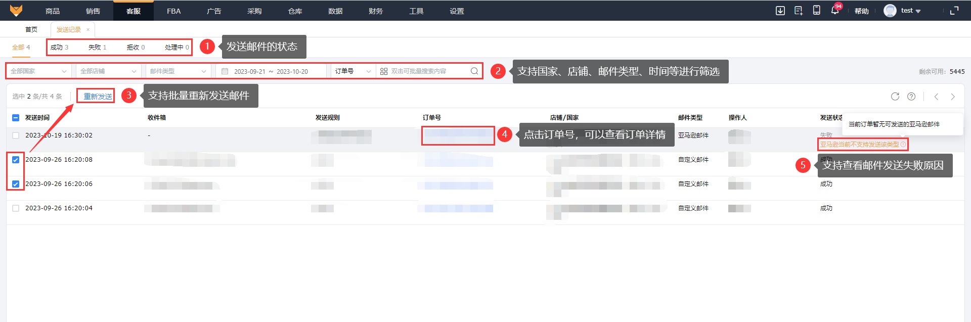 3.支持批量重新发送邮件。点击订单号,可以查看订单详情。
