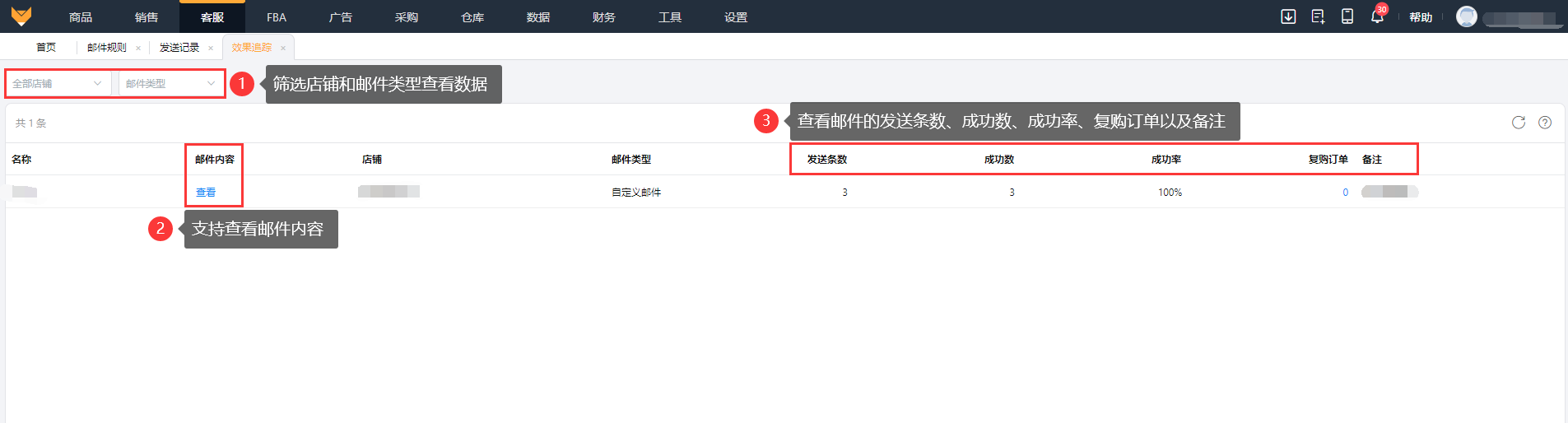 1.效果追踪支持查看邮件的发送条数、成功数、成功率、复购订单以及备注,方便查看发送邮件之后产生的效果。