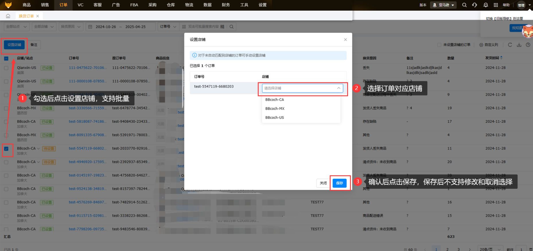 系统无法识别换货订单对应的店铺时,支持手动绑定店铺,勾选对应的订单,点击"设置店铺",选择对应的店铺即可。