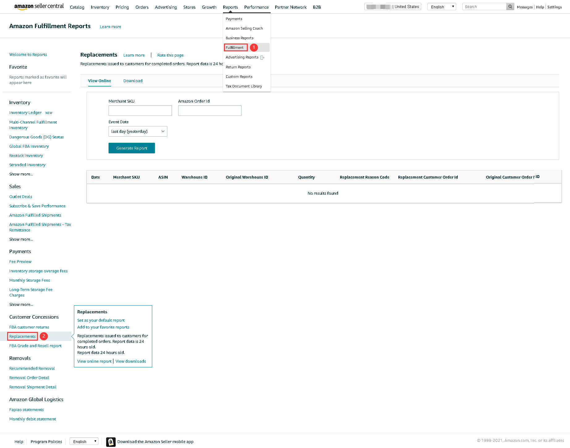 换货报告亚马逊后台下载位置:【Reports】>【Fulfillment】>【Replacements】。