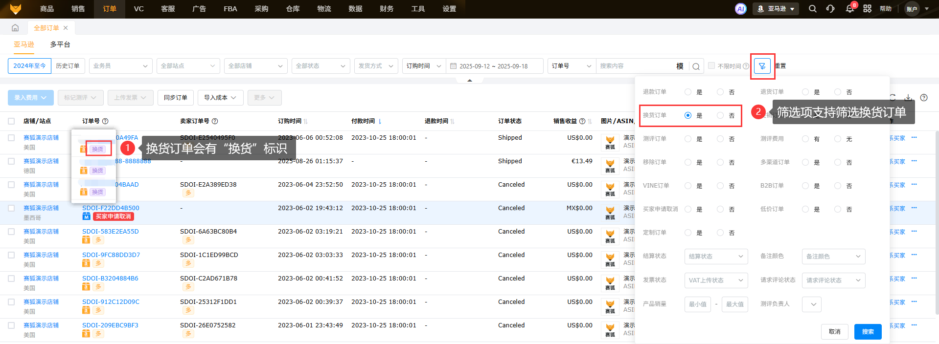 换货订单在【订单】>【全部订单-亚马逊】会显示“换货”标识,【全部订单-亚马逊】页面支持换货订单筛选。