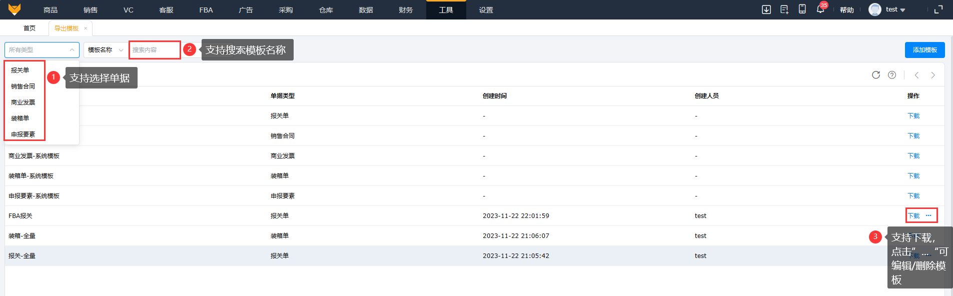 支持筛选单据类型,搜索模板名称;支持下载、编辑/删除模板。