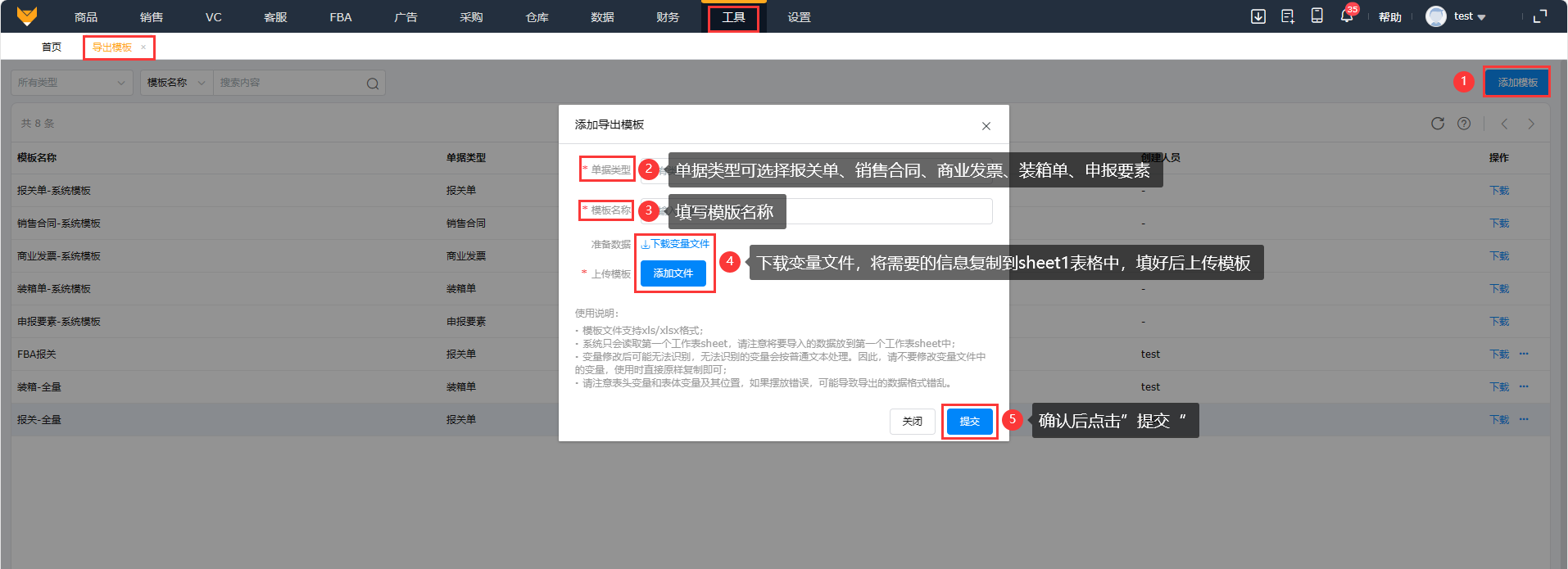 单据类型可选择报关单、销售合同、商业发票、装箱单、申报要素;下载变量文件,将需要的信息复制到sheet1表中,填后上传模板。