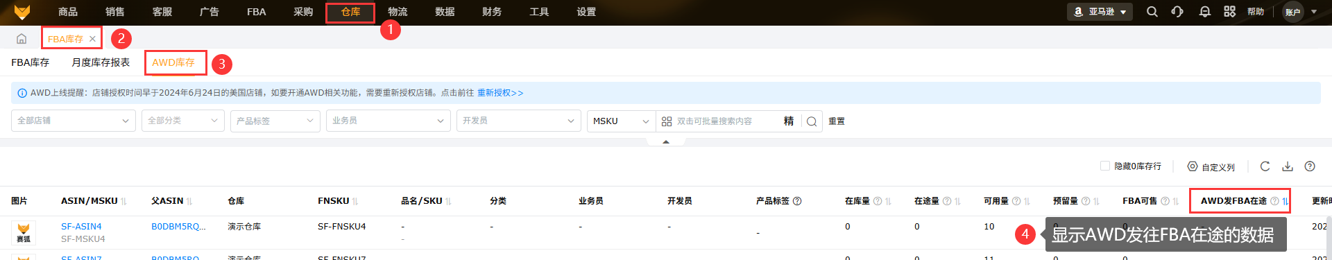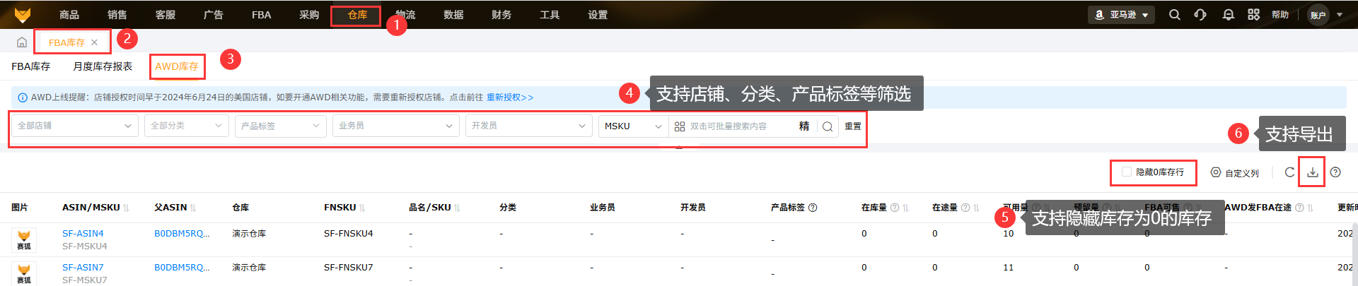 AWD库存主要展示在库量、在途量、可用量、预留量以及FBA可售等字段,用户可及时掌握AWD库存信息,为采购、补货等提供数据支撑。