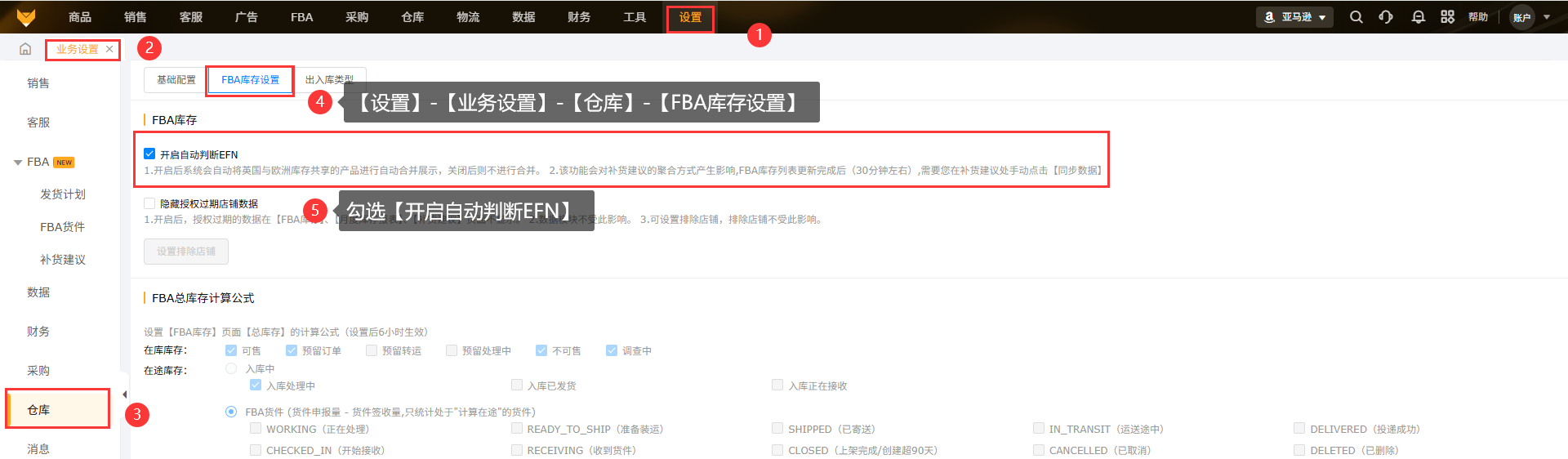 (1)需要在【设置】>【业务设置】>仓库>FBA库存【开启自动判断EFN】开启后系统会自动将英国与欧洲库存共享的产品进行合并展示,关闭后则不进行合并