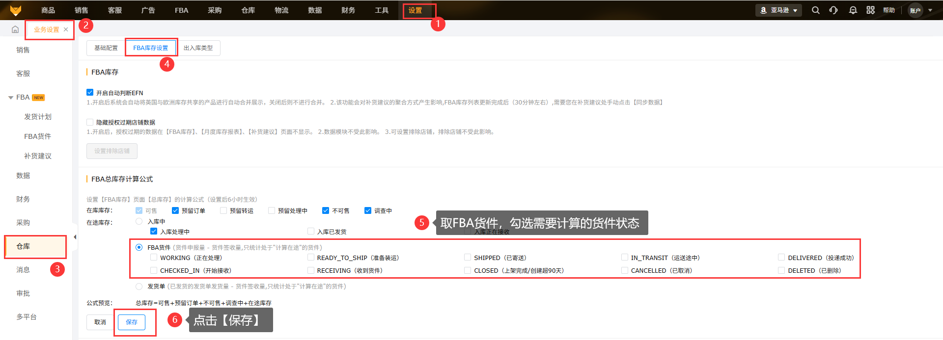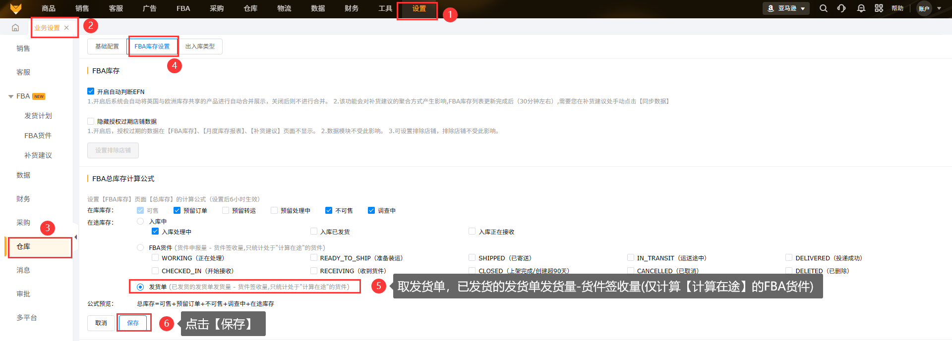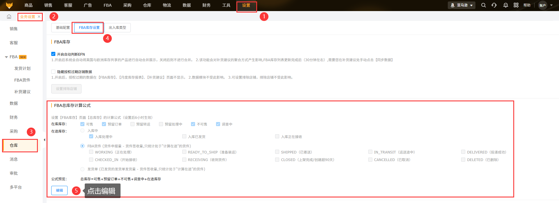 (1)设置【FBA库存】页面【总库存】【在途】的计算公式(设置后6小时生效)