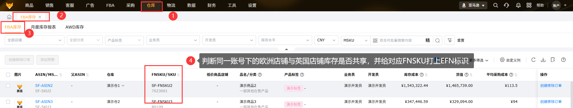 (2)开启【自动判断EFN】后,系统会立即执行判断同一账号下的欧洲店铺与英国店铺库存是否共享,并给对应FNSKU打上EFN标识。