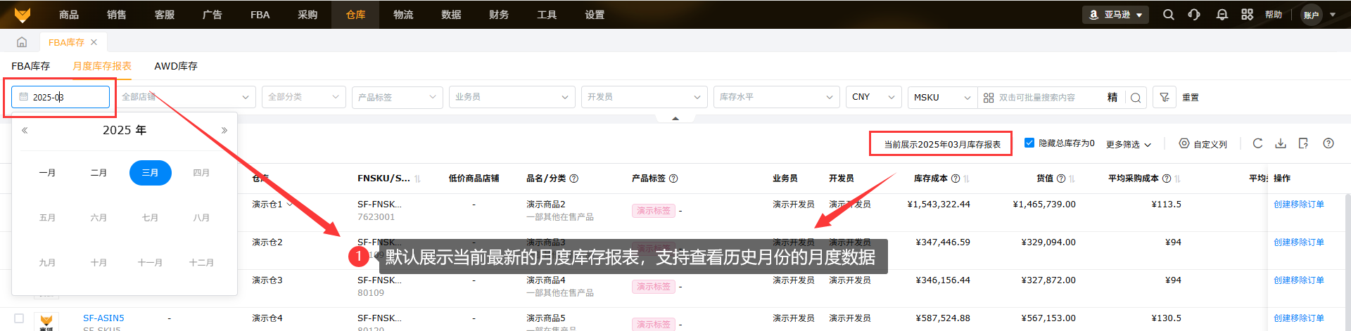 每月最后一天最后一秒(按照北京时间)生成月度库存报表并结存,默认展示当前最新的月度库存报表,支持查看历史月份的月度数据。