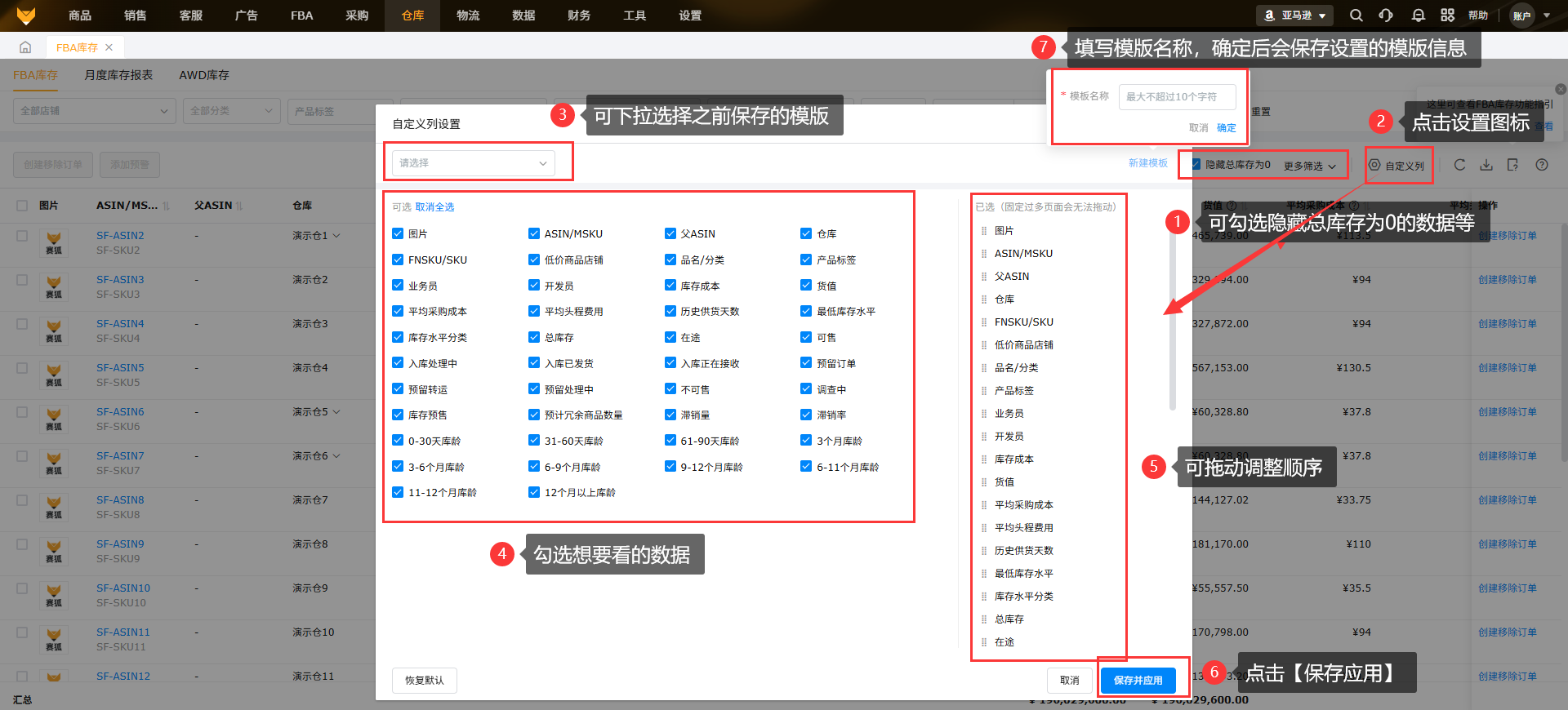(1)点击【自定义】,勾选您想要展示的列,保存以后将默认您勾选的列;(2)隐藏库存为0的数据。