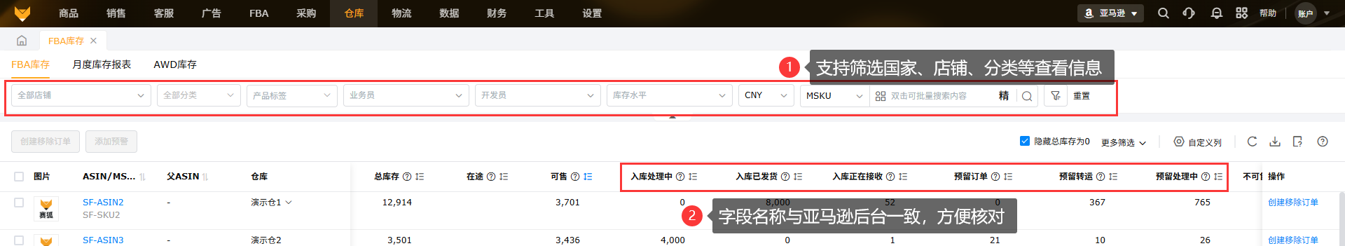 (1)可对国家、店铺、分类、切换币种、MSKU/FNSKU/品名/SKU/ASIN进行搜索,支持模糊搜索。