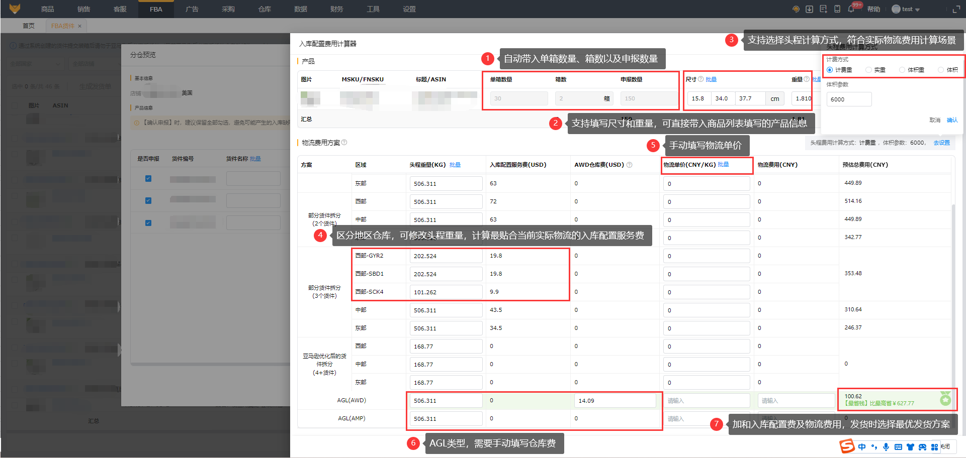 物流费用方案为亚马逊优化后的货件拆分方案,可手动录入运输重量用于计算入库配置服务费