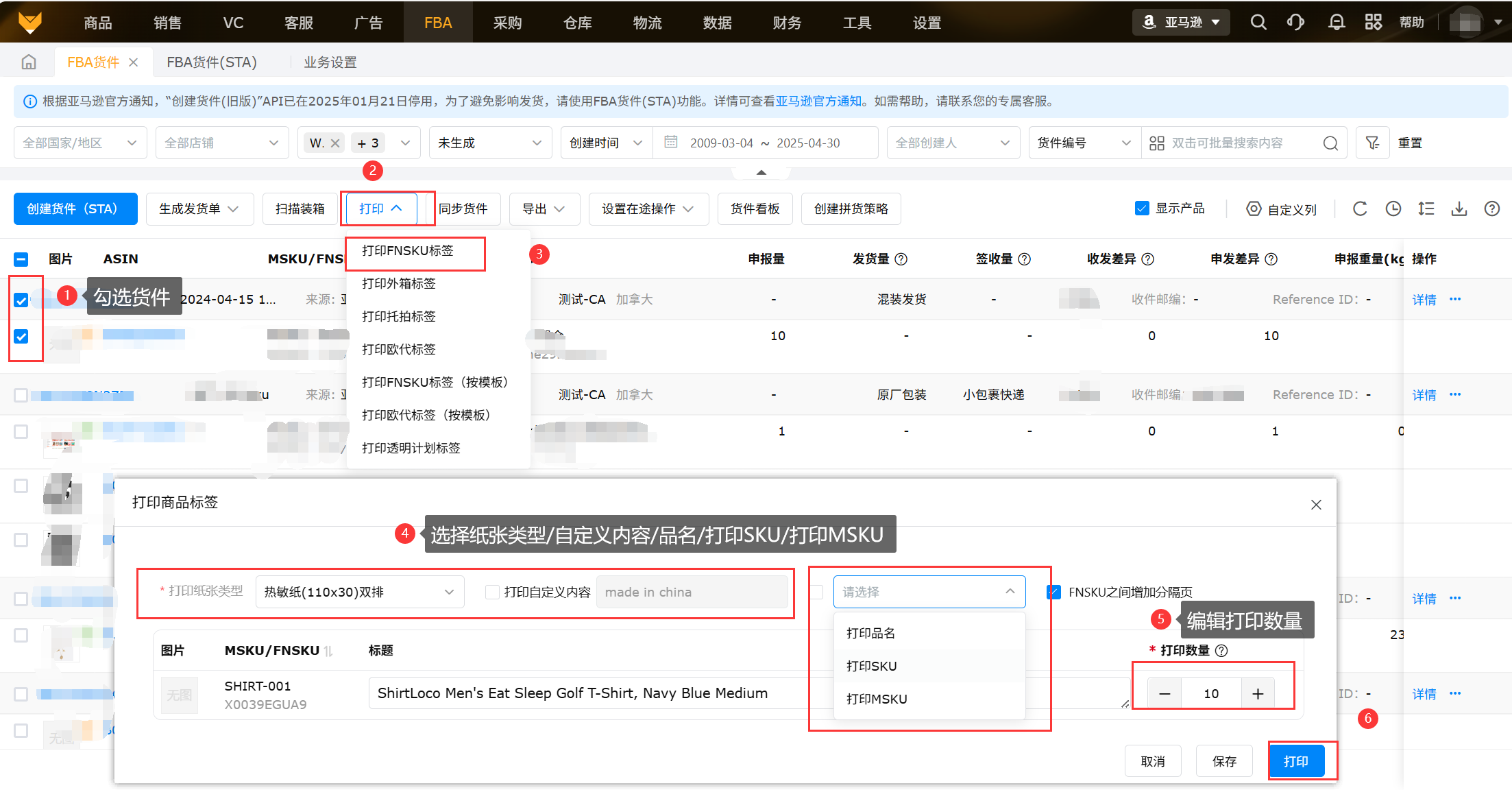勾选想要打印FNSKU标签的货件,点击【打印FNSKU标签】,可以批量设置标签规格和打印数量,打印自定义内容/品名/SKU/MSKU。