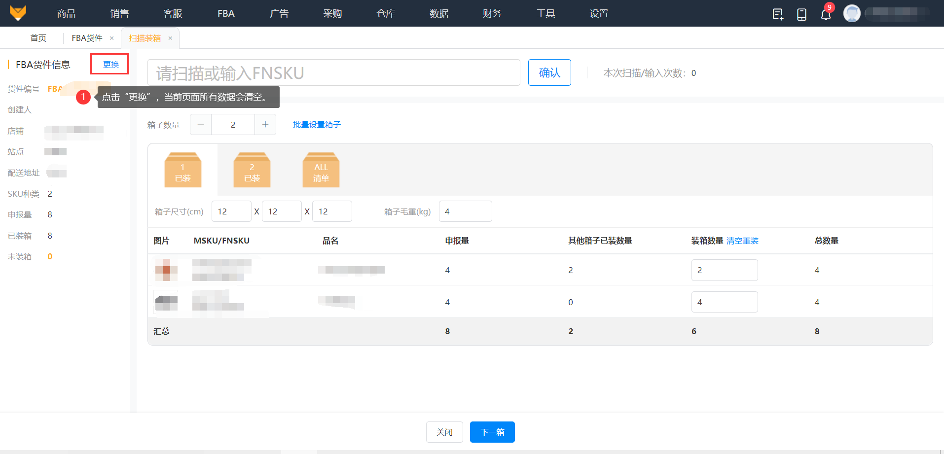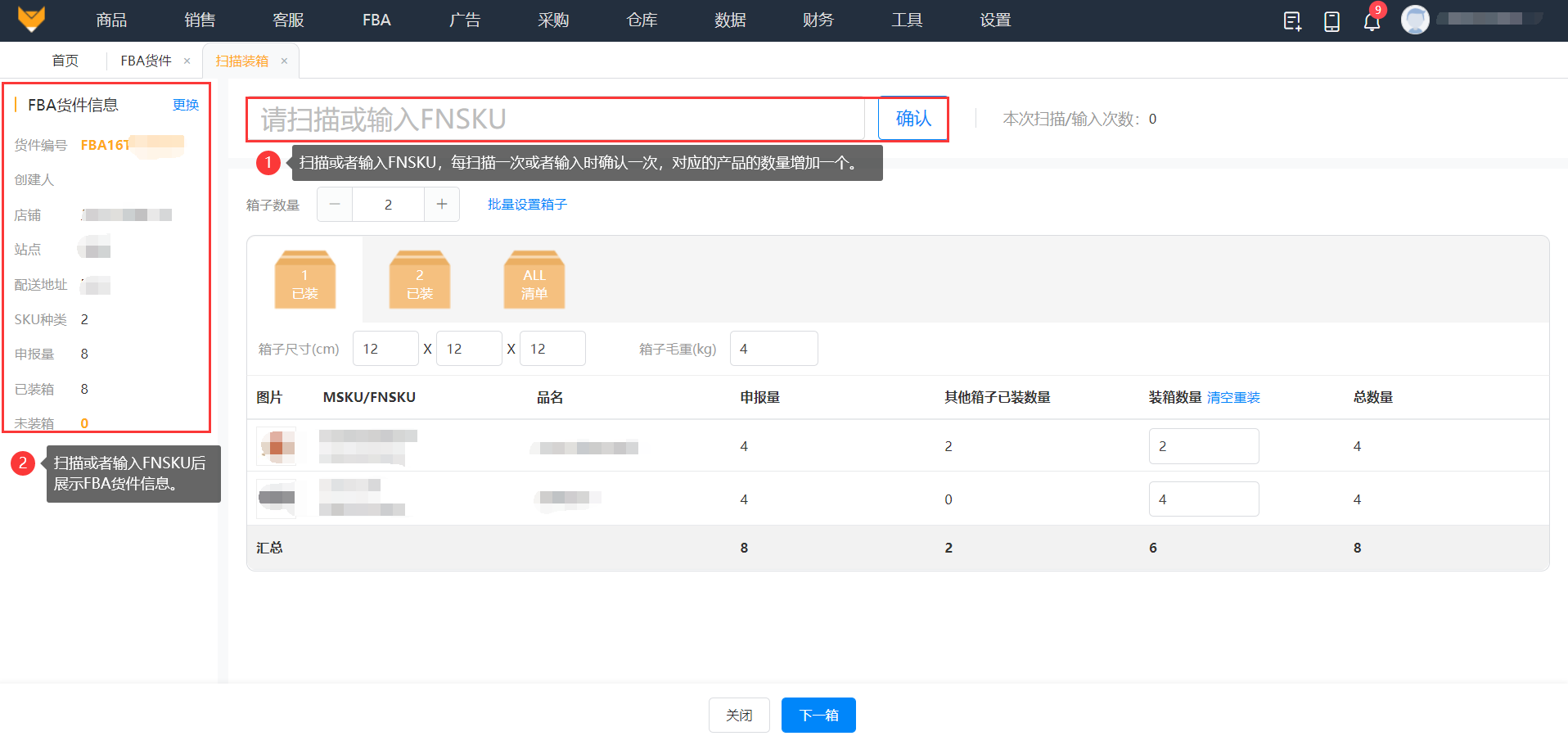 在FBA发货装箱的流程中针对混箱发货、多变体SKU、多SKU多箱发货等情况,通过扫描FNSKU条码进行装箱,既能有效的提高装箱的准确率,又能缩短装箱时间,提高工作效率。