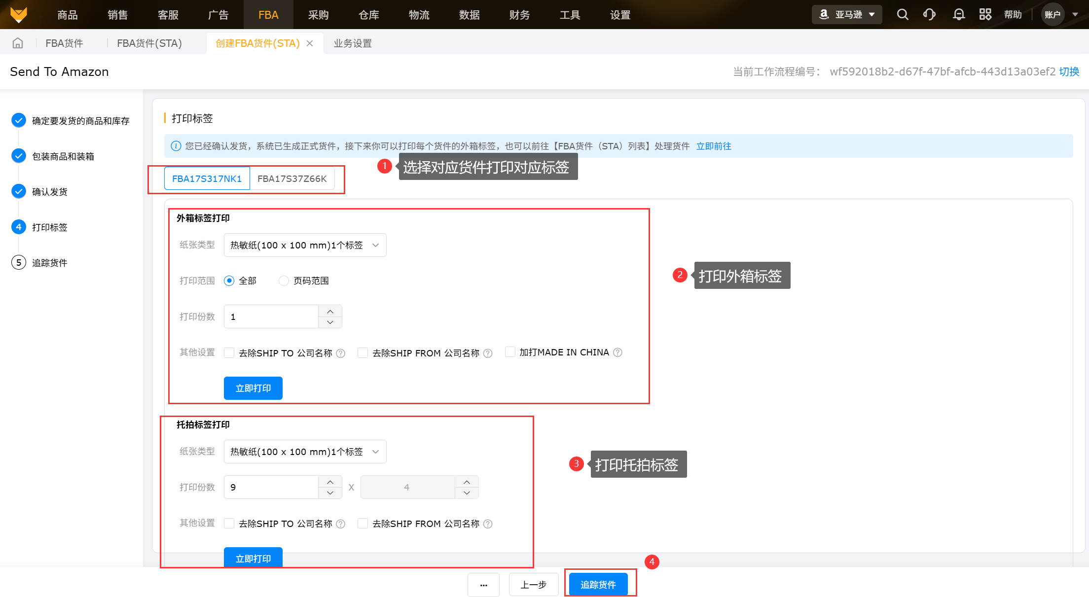 因此需要到后台打印外箱标签,或者在后台将货件置为已发货状态,在赛狐打印即可。