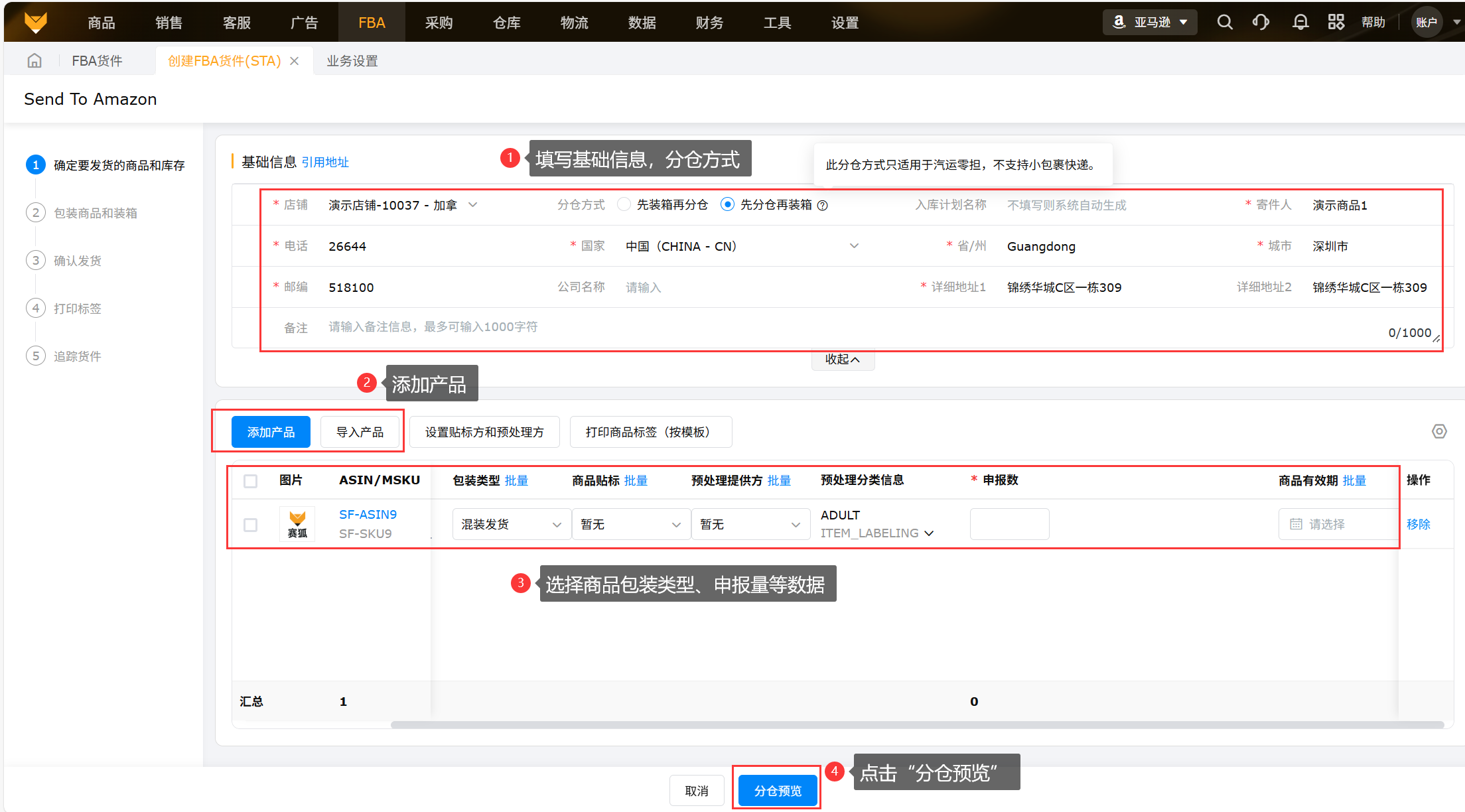 【FBA货件】-【创建货件(STA)】-【分仓预览】
