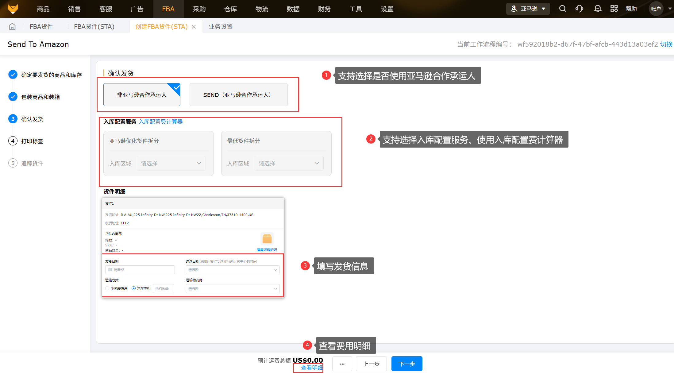 选择预计发货日期、货件发货信息,支持查看费用明细,确认后可进入下一步。(确认发货之前支持重新装箱)