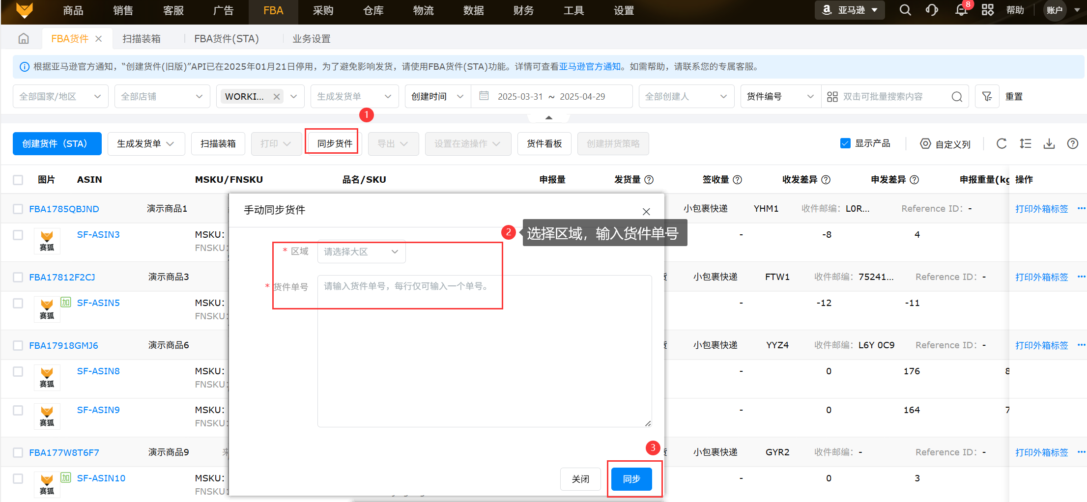 可以手动同步货件,点击【同步货件】,选择区域和货件单号即可把货件信息同步过来,能够获取3个月前的货件号或者是把最新的货件号立即同步过来。
