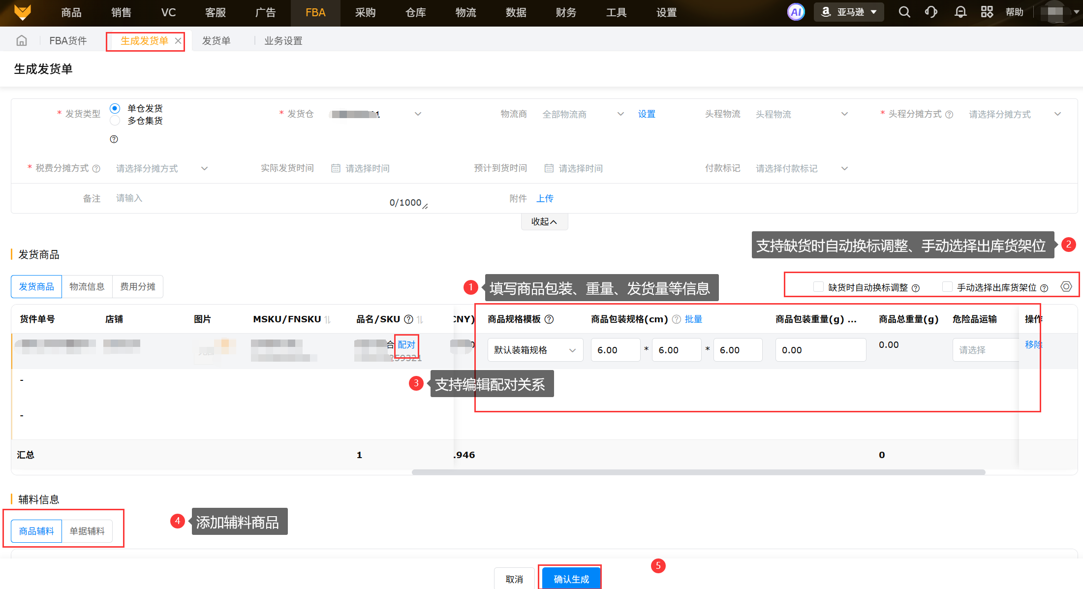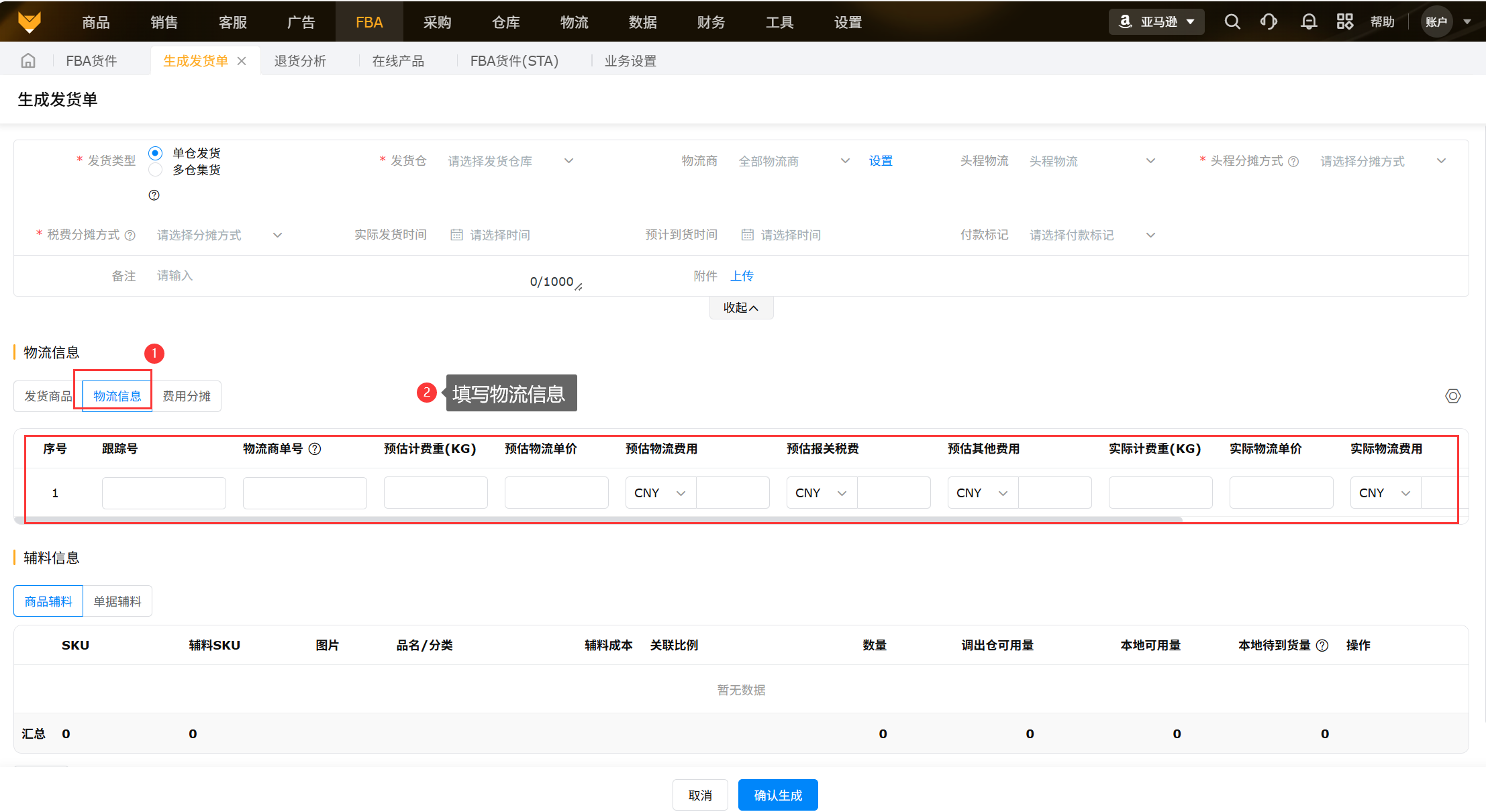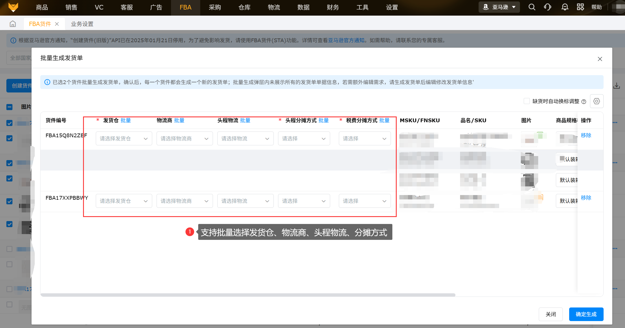 创建好货件后,需要发货到FBA仓时,可通过货件生成发货单,分配库存,库存出库,分摊头程物流;