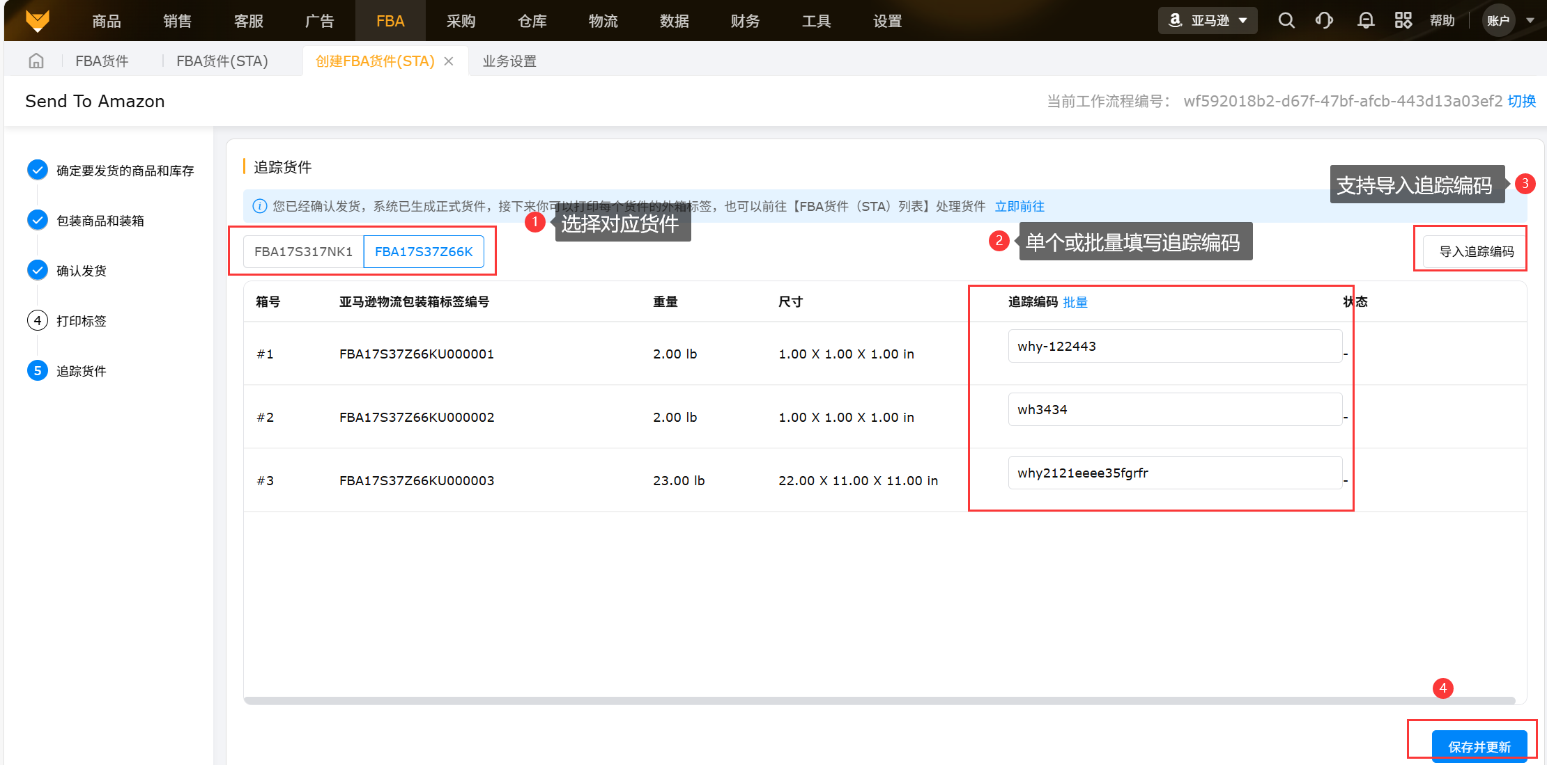 选择货件号,填写或导入追踪编码,点击保存并更新。