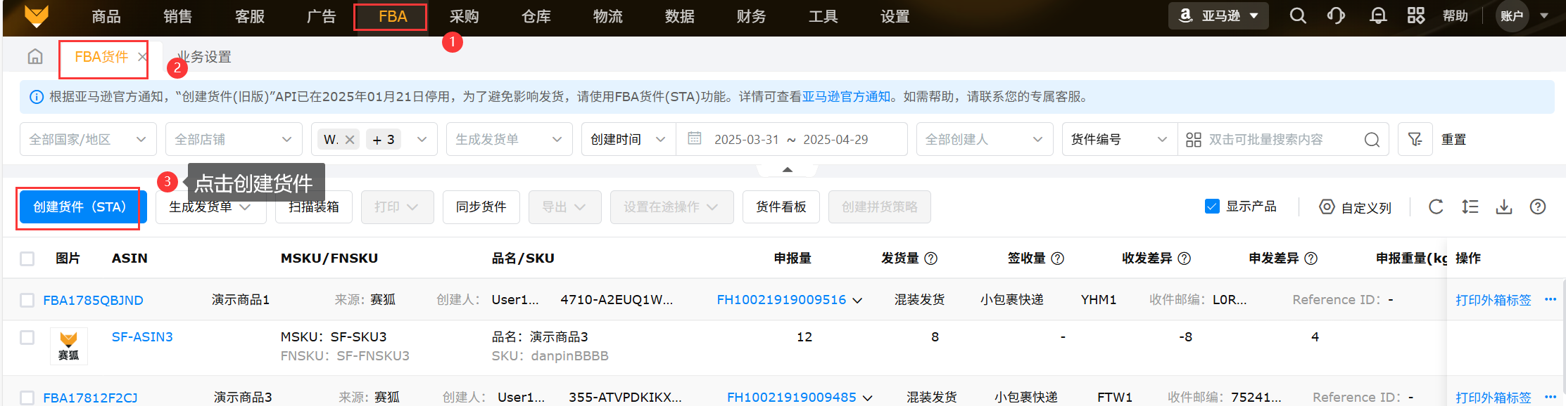 在【FBA】-【FBA货件】页面点击【创建货件(STA)】