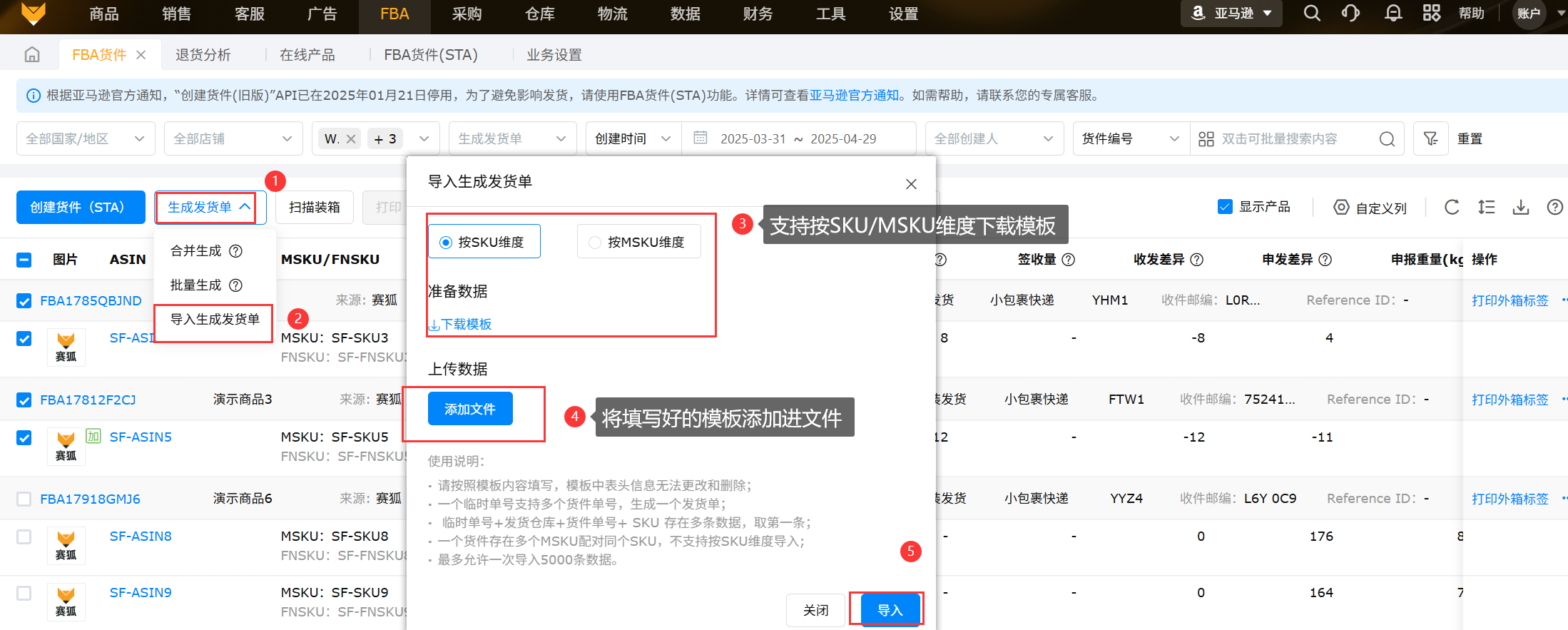支持按SKU或MSKU维度导入生成发货单