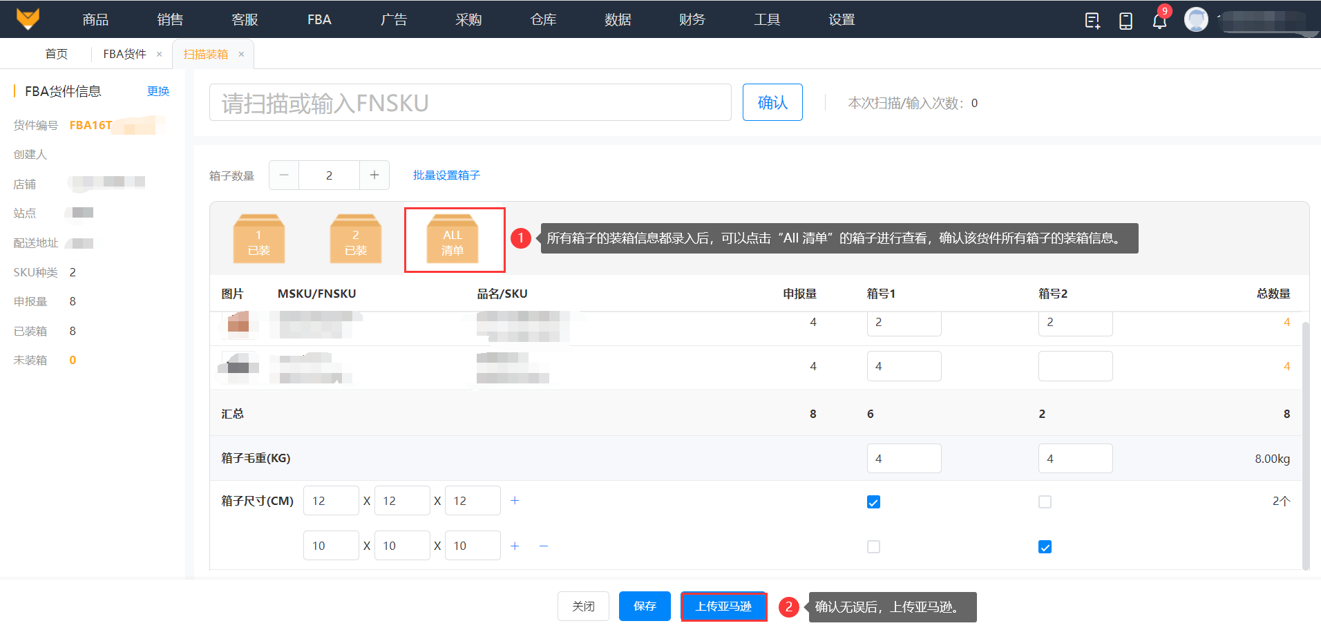 ④所有箱子的装箱信息都录入后,可以点击“All 清单”的箱子进行查看,确认该货件所有箱子的装箱信息,确认无误后,点击“上传亚马逊”。