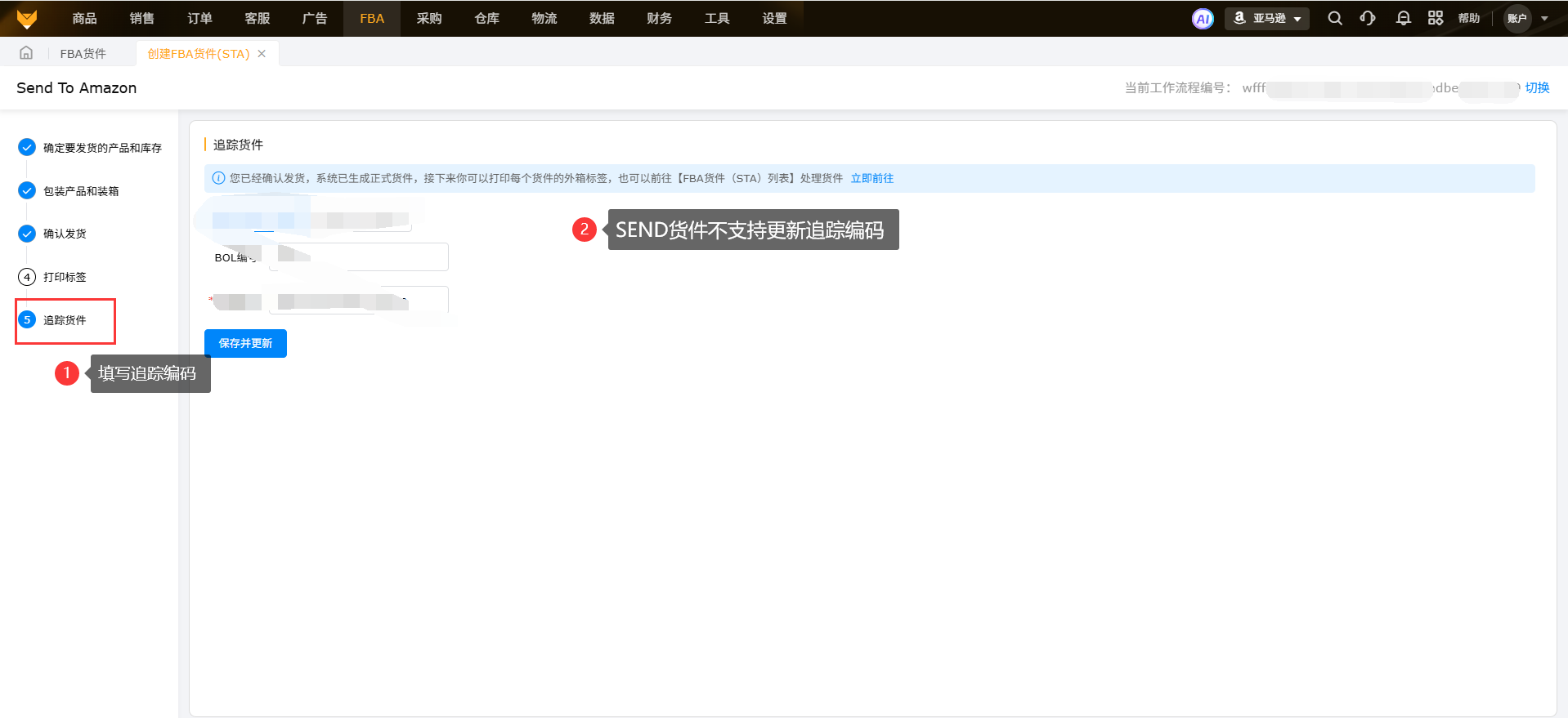④追踪编码:SEND货件不支持更新追踪编码,会提示“SEND合作承运人货件追踪编码由亚马逊自动更新,无需手动编辑”