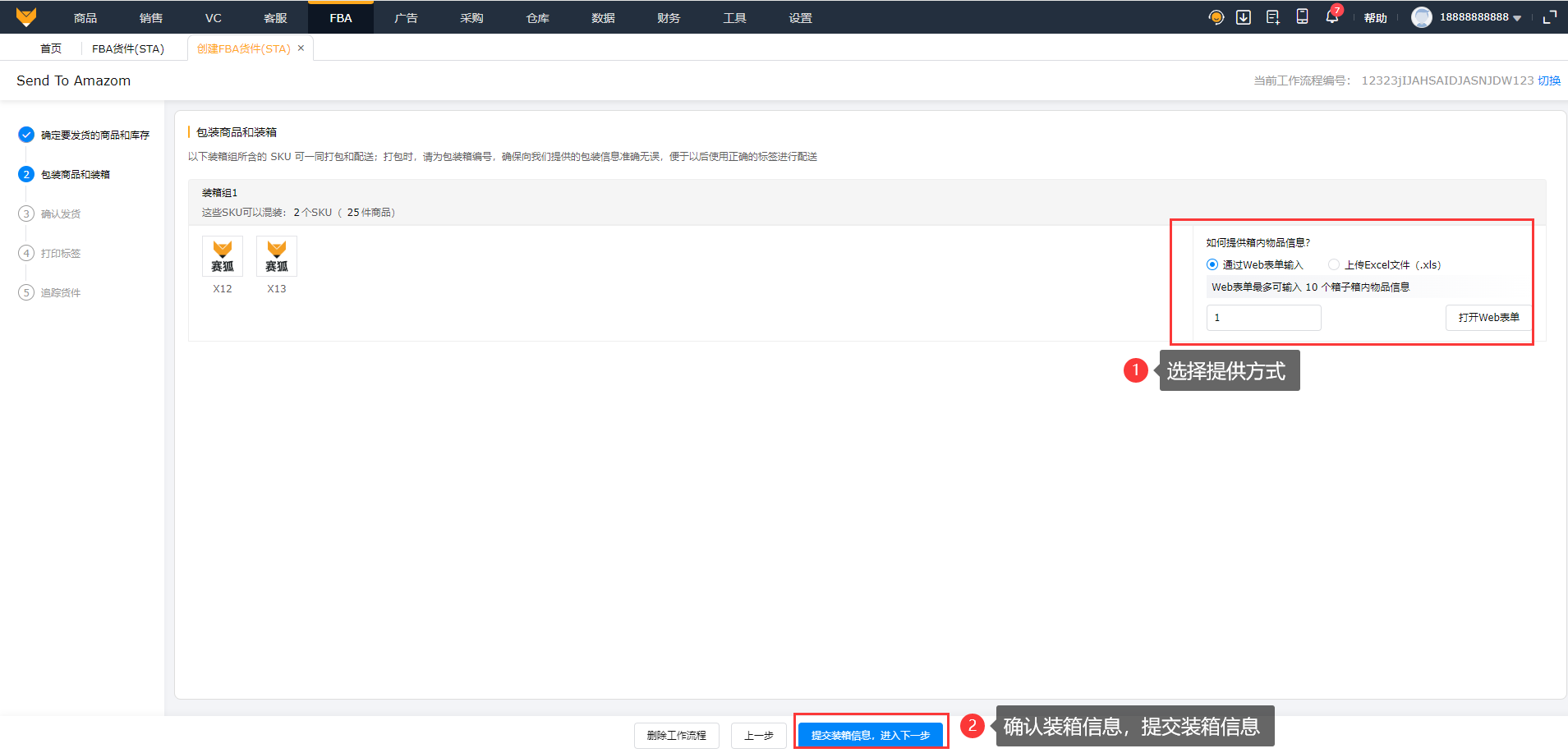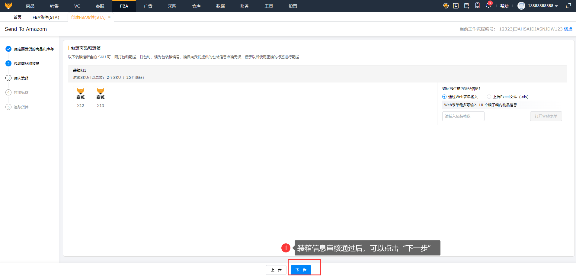 亚马逊生成装箱组后,按照装箱组包装商品并上传装箱资料,单个装箱组/货件,支持导入最多3000条数据 ,支持扫描装箱。